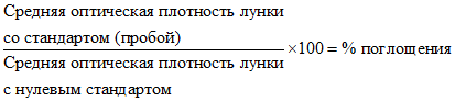 Средние значения оптической плотности, измеренной в лунках со стандартными и исследуемыми растворами делятся на среднее значение оптической плотности, измеренной в лунках с первым (нулевым) стандартом, результат умножается на 100. Таким образом, результат измерения оптической плотности выражается в процентах от оптической плотности лунки с нулевым стандартом, то есть: