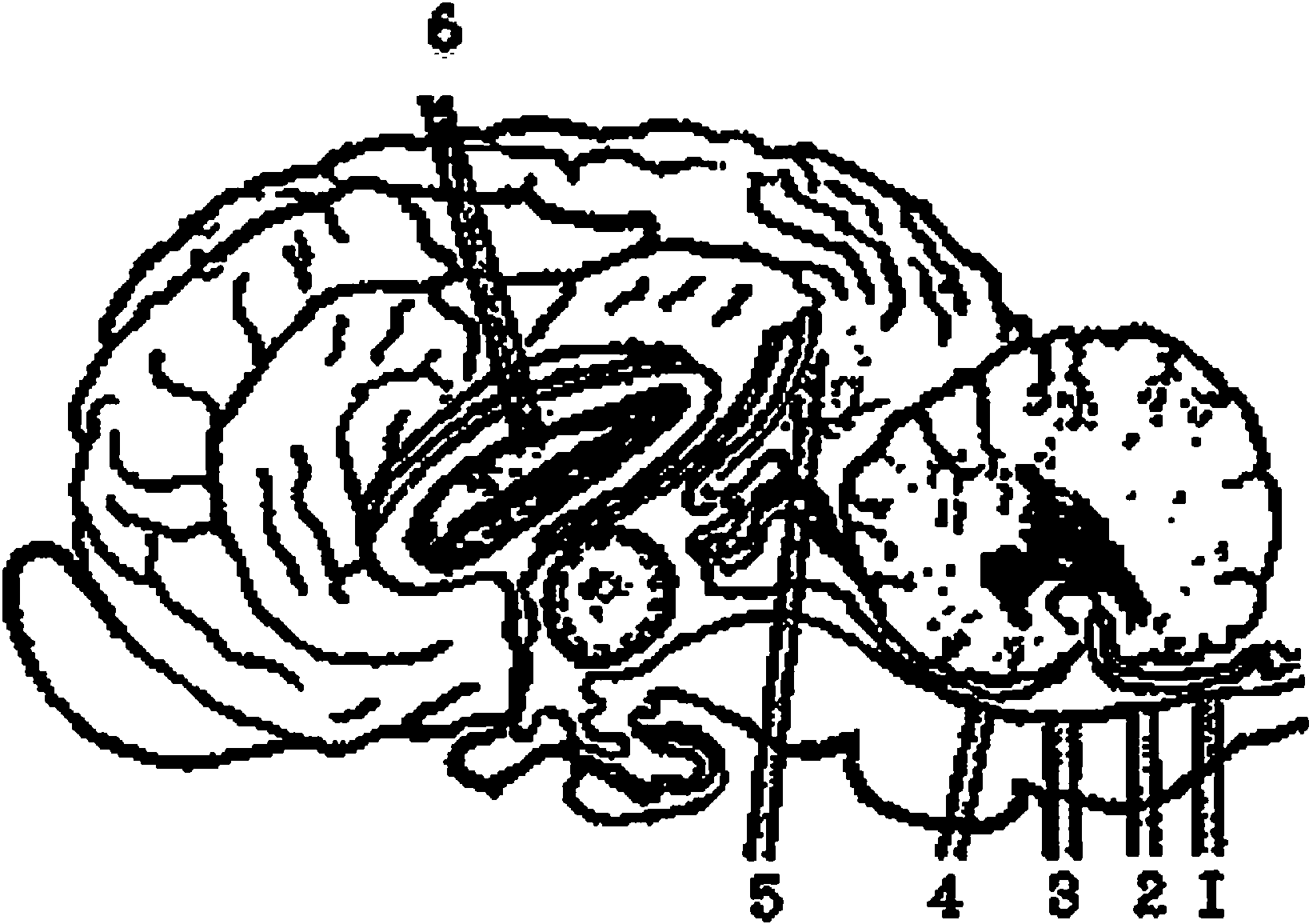 2.1. Для гистологического исследования вырезают поперечные кусочки толщиной 0,3 - 0,5 см из следующих отделов головного мозга: