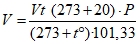 Для удобства расчета V следует пользоваться таблицей коэффициентов (Приложение 2). Для приведения объема воздуха к температуре 20°С и к давлению 760 мм рт.ст. надо умножить Vt на соответствующий коэффициент.