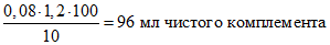Так как общий объем комплемента на 100 пробирок должен быть 100·0,1 = 10 мл, то к полученному числу неразведенного комплемента добавляют 9,04 мл физиологического раствора. Аналогичным методом высчитывают 1,5 дозы комплемента.