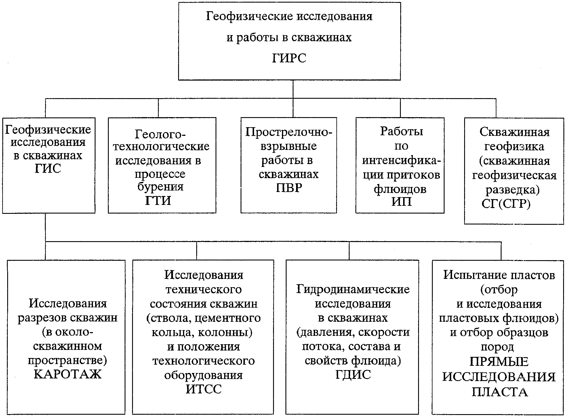 Обобщающий термин "геофизические исследования и работы в скважинах" (ТИРС) - исследования и работы, основанные на измерениях естественных и искусственных физических полей во внутрискважинном, околоскважинном и межскважинном пространствах (ГИС и СГР), а также работы, связанные с вторичным вскрытием продуктивных пластов перфорацией (ПВР) и интенсификацией притоков (ИП).