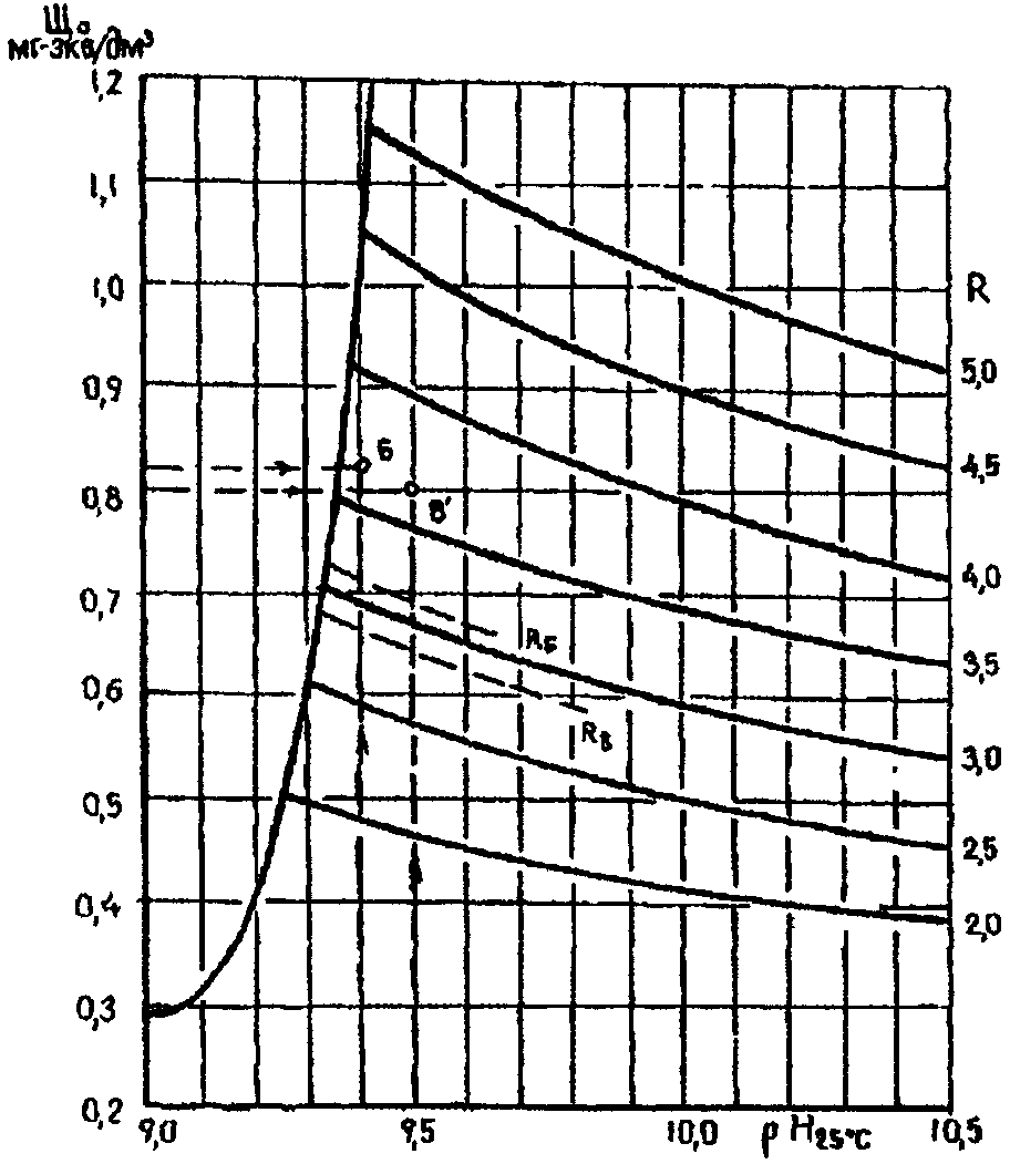 рис. 10в номограммы II по значениям щелочности общей и pH находим точку (Б) и определяем положение изолинии с величиной