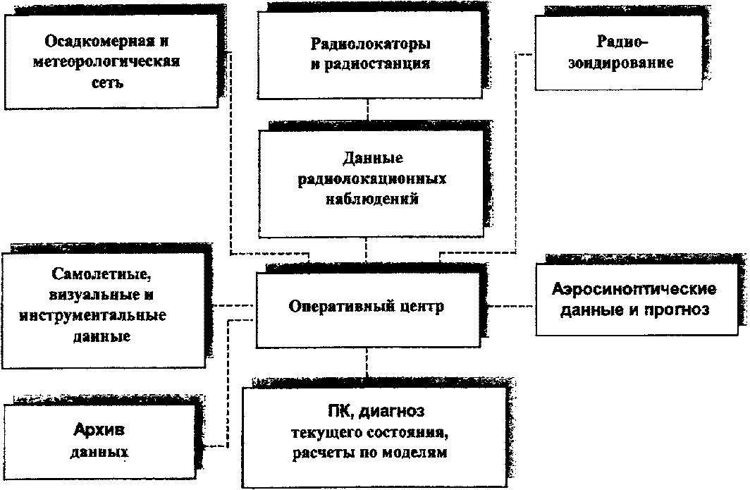 5.2.1 Для получения метеорологической информации, необходимой при прогнозировании рабочей ситуации для проведения летных работ, при принятии решения о возможности и целесообразности разрушающего АВ на облака, при выработке команды на воздействие и ее корректировке в процессе воздействия, при оперативном контроле эффекта воздействия, а также при оценке результатов воздействий, используются данные информационно-измерительной системы (ИИС). Основные элементы ИИС или обеспечиваемые ими информационные потоки иллюстрируются на