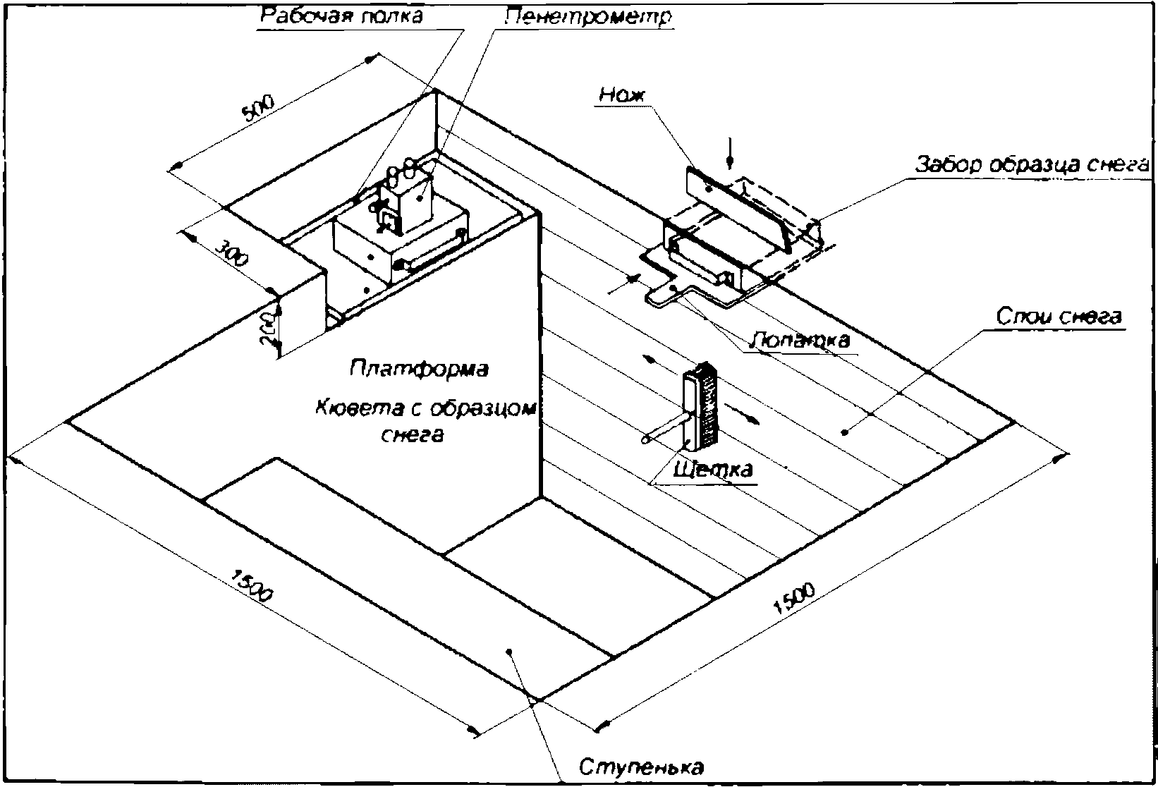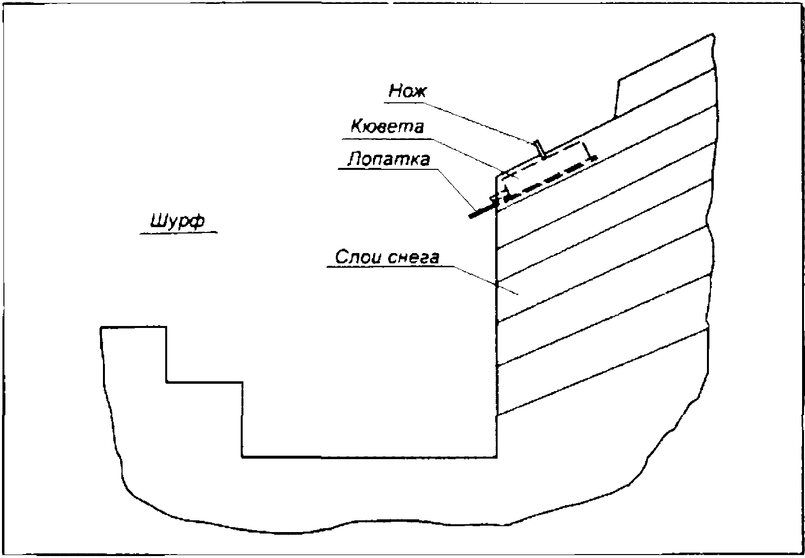 (рисунок 2). В боковой стенке вырубить рабочую полку. Фронтальную стенку шурфа вырубить строго вертикально (по отвесу) и щеткой с мягкой щетиной очистить ее до четкого выявления слоев снега. Движения щетки должны быть параллельны слоям снега, то есть слева направо и сверху вниз. На рабочей полке выставить с помощью уровня платформу