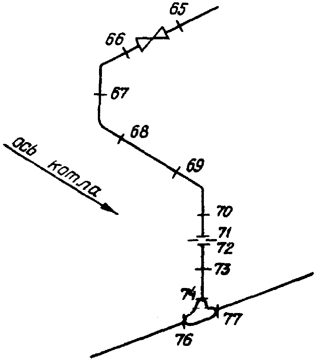 Анализ на смонтированном паропроводе проводится по схеме паропровода в соответствии с нумерацией сварных стыков (рис. 2). Запись результатов анализов ведется согласно номеру сварных стыков, ограничивающих место анализа: например, участок трубы между стыками "69-70" обозначается "труба 69-70", задвижка между стыками "65-66" - "задвижка 65-66" и т.д., а металл сварных швов непосредственно номером стыка. Протоколы без приложения схем недействительны.
