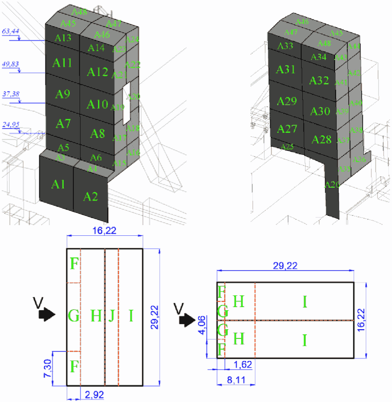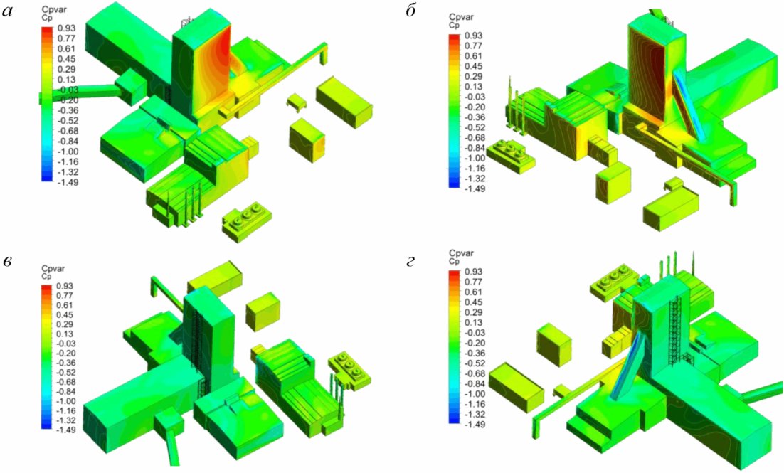 cp,- определяются на основе результатов модельных испытаний сооружений в аэродинамических трубах, численного моделирования или с учетом данных, опубликованных в технической литературе (