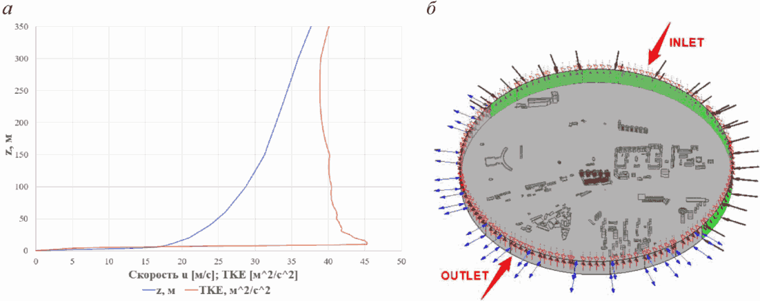Согласно этим формулам, на входе задавались интенсивность турбулентности и масштаб турбулентности, равный 42 м в соответствии с рекомендациями