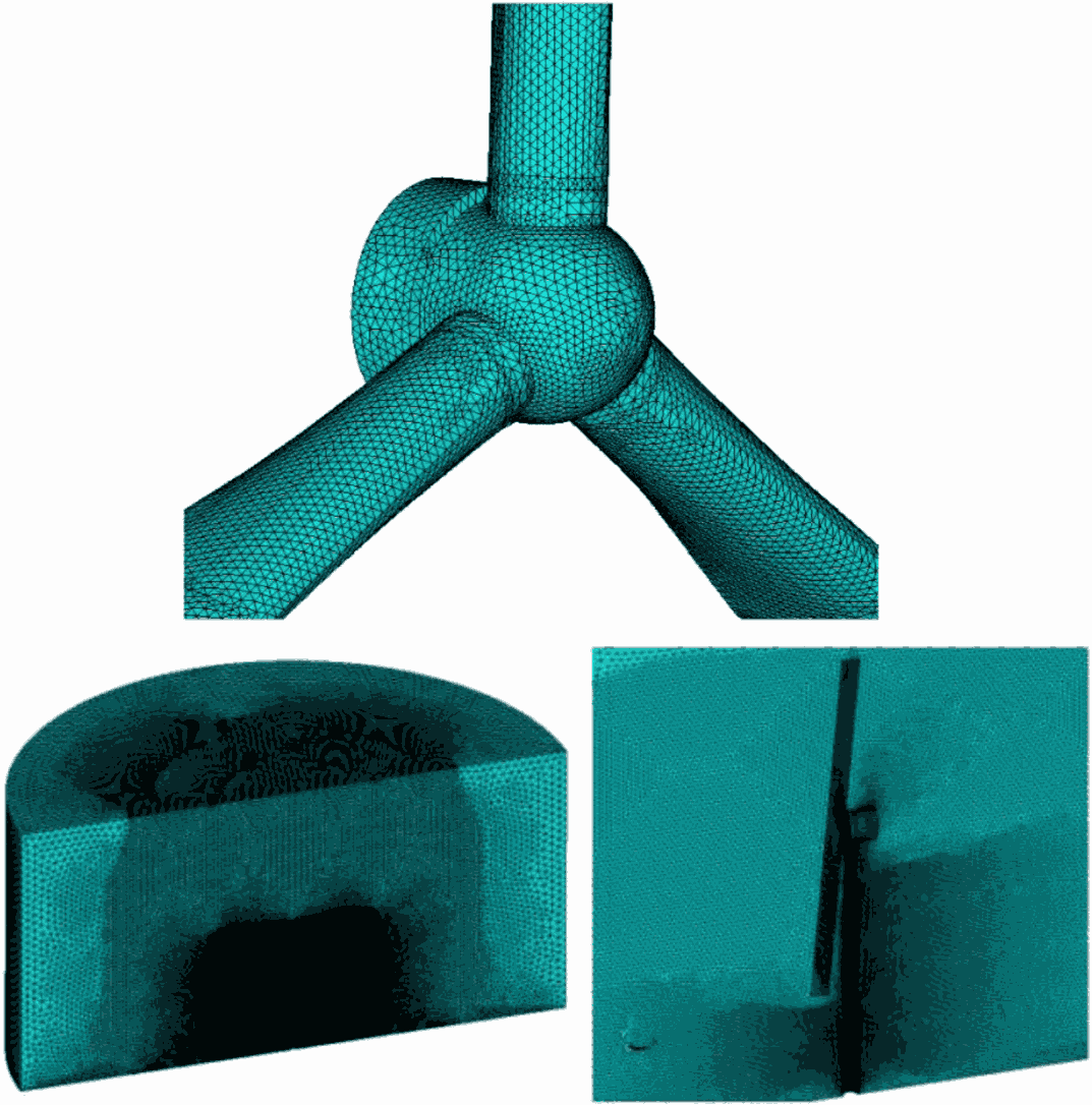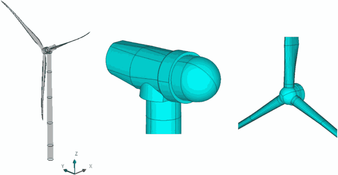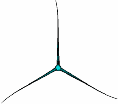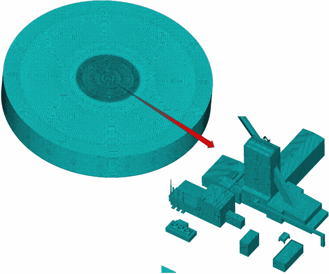 Расчетная модель формируется следующим образом: после создания в программном комплексе объемной геометрической модели ВЭУ, она "вычитается" из модели воздушного пространства (в форме цилиндра высотой 250 м и радиусом 300 м). Далее полученная область разбивается на конечные объемы.