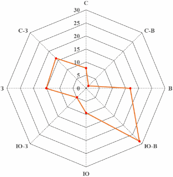 В результате проведенных расчетных исследований (при пяти направлениях ветра) аэродинамики ВЭУ для двух положений лопастей определены наиболее опасные расчетные углы атаки ветра.