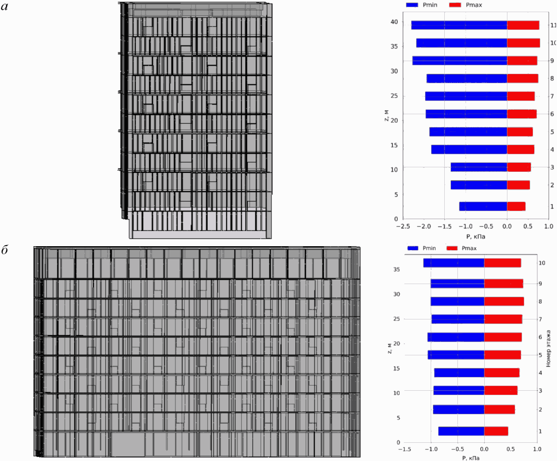 Максимальное и минимальное значения ветрового давления | Pmax, Pmin, Па (кПа) | Вычисленные максимум и минимум ветрового давления по времени | - |