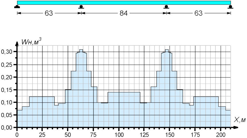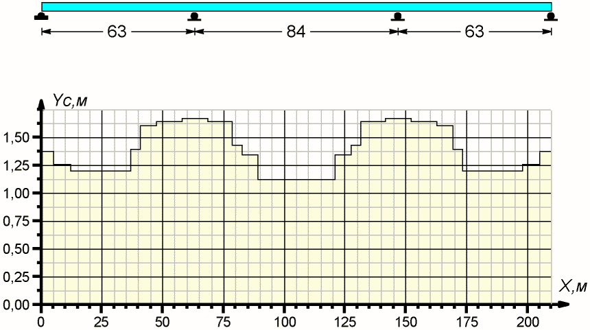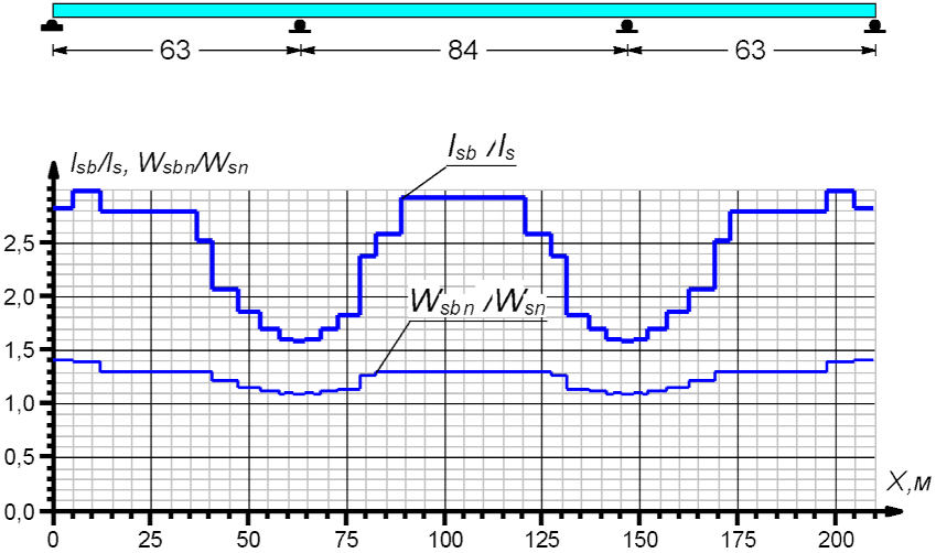 Неразрезное сталежелезобетонное пролетное строение моста включает три пролета по схеме 63 + 84 + 63 м. Примеры расчета выполнены применительно к габариту проезда Г-10 + 2 x 1,5 м.