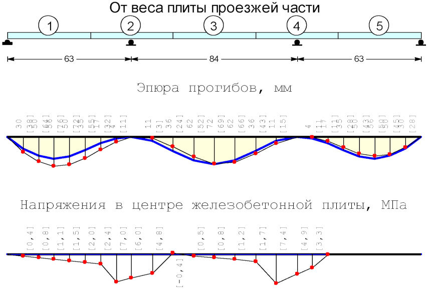 - нагрузки от веса железобетонной плиты проезжей части, вычисляемые с учетом последовательности приложения нагрузок в процессе бетонирования;