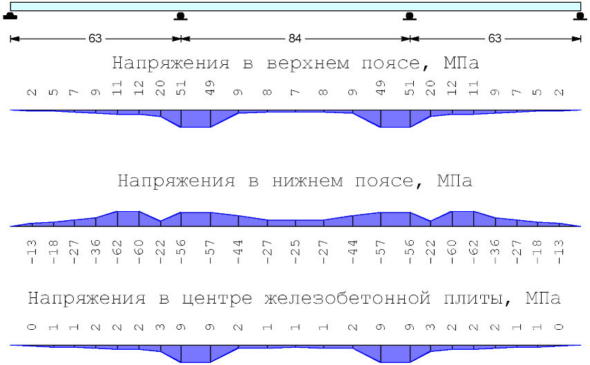 На нагрузки от веса металлоконструкций балки работают стальным сечением. Нагрузки от веса плиты проезжей части воспринимают балки, состоящие из стальных и сталежелезобетонных участков, совокупность которых в процессе сооружения плиты постепенно меняется - от стальной до сталежелезобетонной конструкции. Остальные нагрузки и воздействия балки воспринимают сталежелезобетонным сечением.