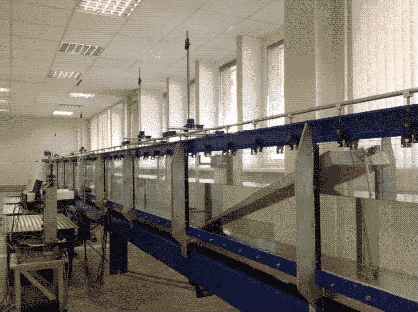 Технические характеристики: габариты лотка - длина рабочей части 12,5 м, ширина лотка 300 мм, глубина лотка 450 мм; максимальный расход 32 л/с; мощность насоса 5,5 кВт, максимальный напор насоса 10 м максимальный расход насоса: 150 м3/ч; механизм установки уклона лотка - ход червячного механизма 0,25 мм за один оборот; диаметр электромагнитного расходомера 100 мм, диапазон измерений электромагнитного расходомера 0 - 150 м3/ч, класс точности 0,3; частота генератора волн до 110 Гц, мощность генератора волн 0,55 кВт.