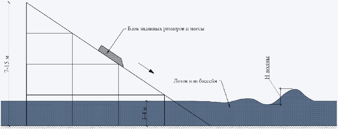 В качестве лабораторной установки для проведения опытов использовался лоток длиной 24,5 м, шириной 0,6 м и глубиной 1 м. С одной стороны лотка была смонтирована рампа с покрытием ПВХ наклонной плоскости скольжения. Блоки, выполненные также из ПВХ, монтируются в исходном положении на вершине рампы при помощи системы шкивов. Для сопряжения поверхности скольжения и поверхности воды радиусом 0,4 м был использован алюминиевый лист.
