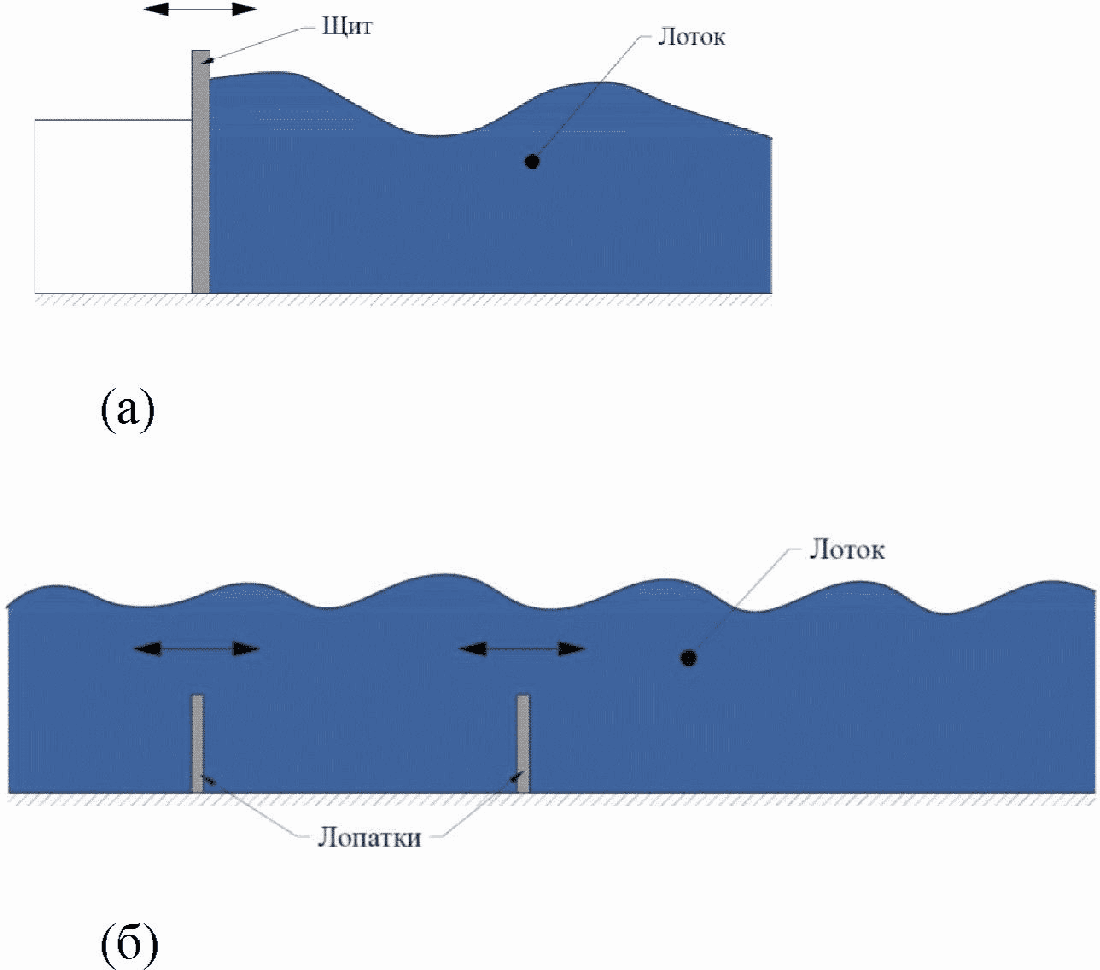 Волна создается при помощи возвратно-поступательных движений специальных лопаток, смонтированных на дне лотка или с помощью щита во все сечение в торце лотка