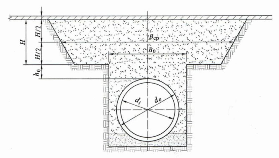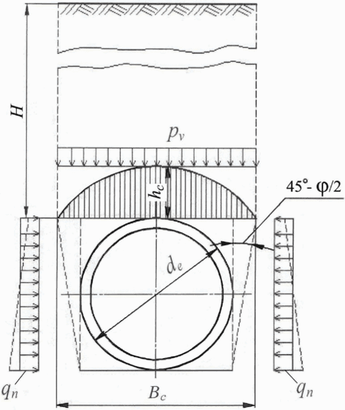 Исходные данные. Бетонная труба диаметром условного прохода di = 800 мм = 0,8 м с плоской подошвой, укладываемая в траншею с высотой засыпки H = 4 м грунтом из суглинка (группа Г-III). Труба укладывается на утрамбованный грунт для безнапорного трубопровода ливневой канализации, расположенного выше уровня грунтовых вод.