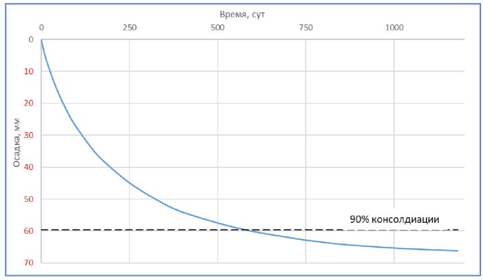 Несмотря на то, что величина осадки менее требуемого значения ([S0] = 15 мм), ее рост на момент 100% завершения фильтрационной консолидации превысит допустимую величину.