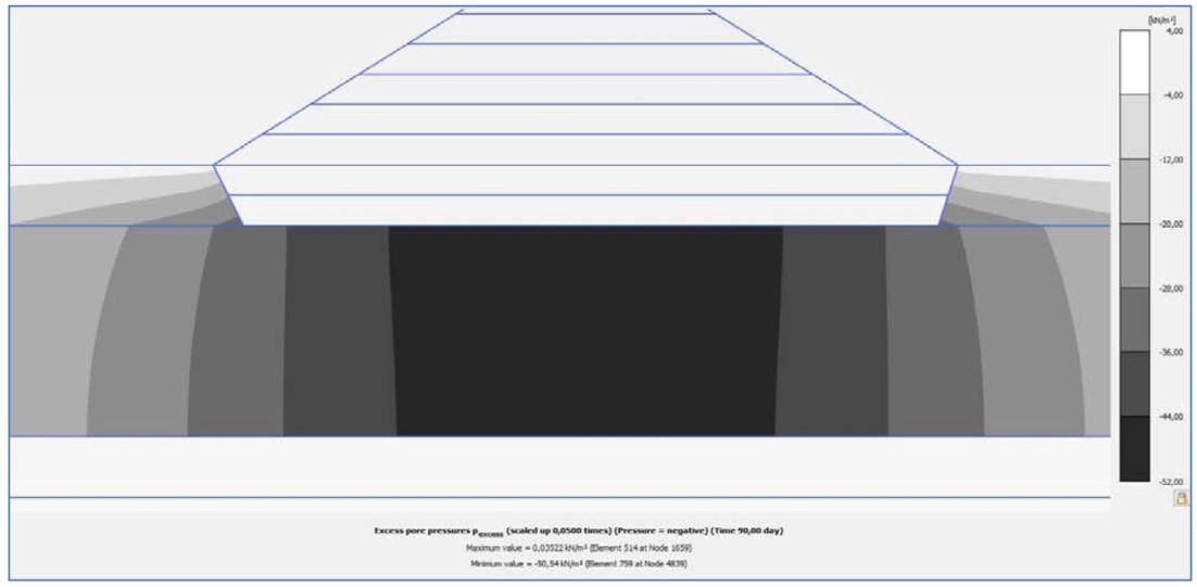 Распределение областей избыточного порового давления в основании насыпи показано на
