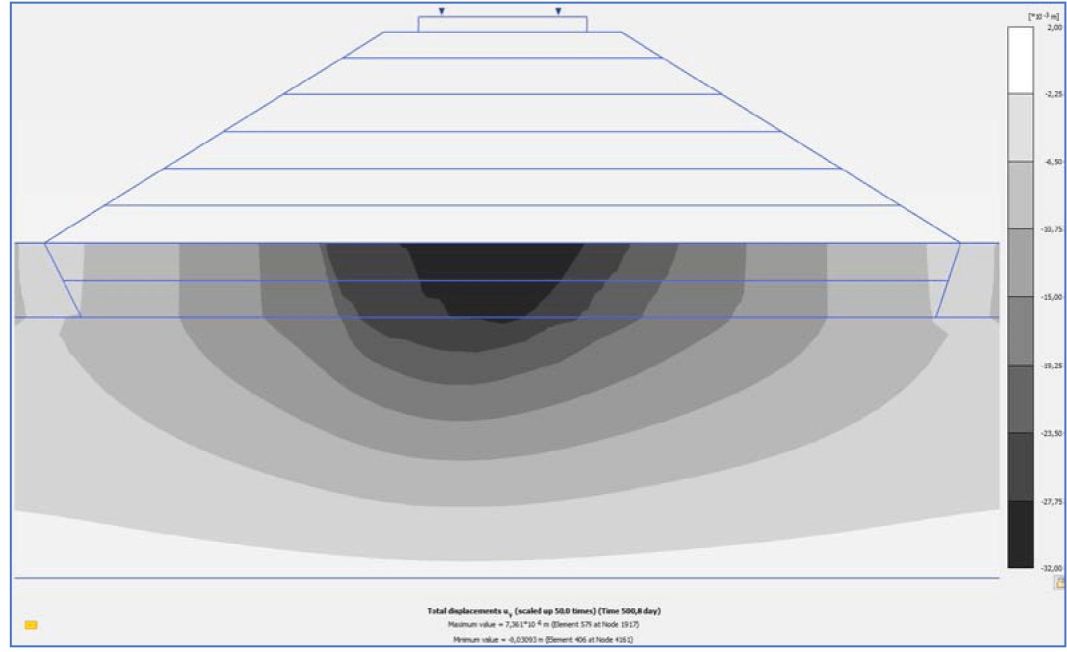 Расчет возведения насыпи выполнен послойно с заданным темпом отсыпки 1 м за 3 дня. После моделирования строительства насыпи выполнен расчет времени консолидации. В этом примере принято решение учесть нагрузку от подвижного состава. Результаты расчета конечной осадки в поперечном сечении численным методом в программном комплексе приведены на