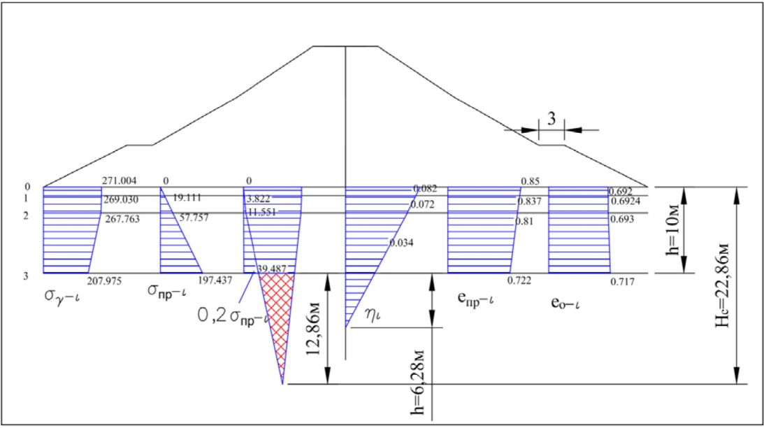 eпр-i и e0-i - средние в слое величины коэффициентов пористости, соответственно природные (до возведения насыпи) и расчетные (после возведения насыпи и полной реализации основной части осадки основания);