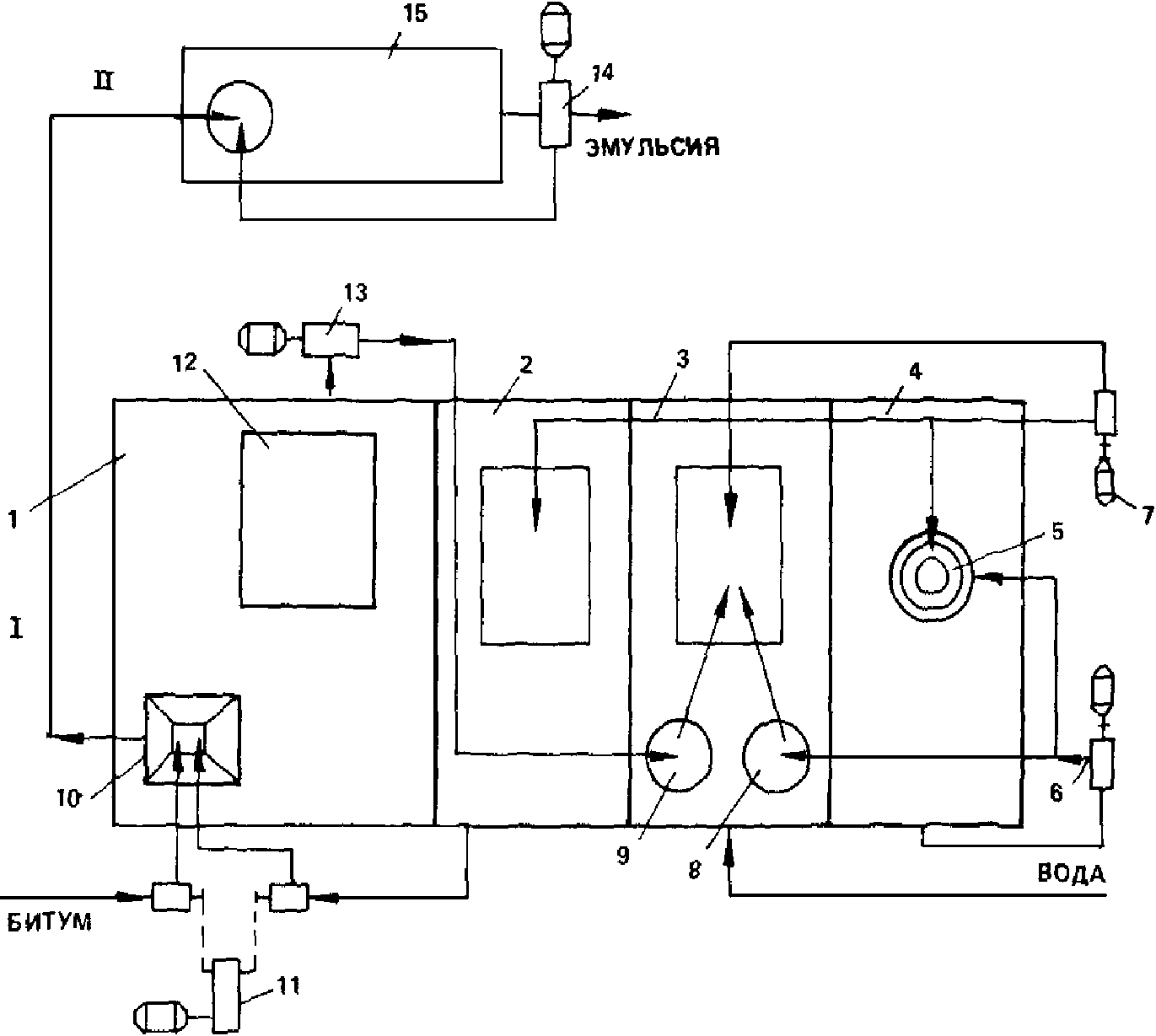 10 - диспергатор; 11 - насос подачи битума и раствора