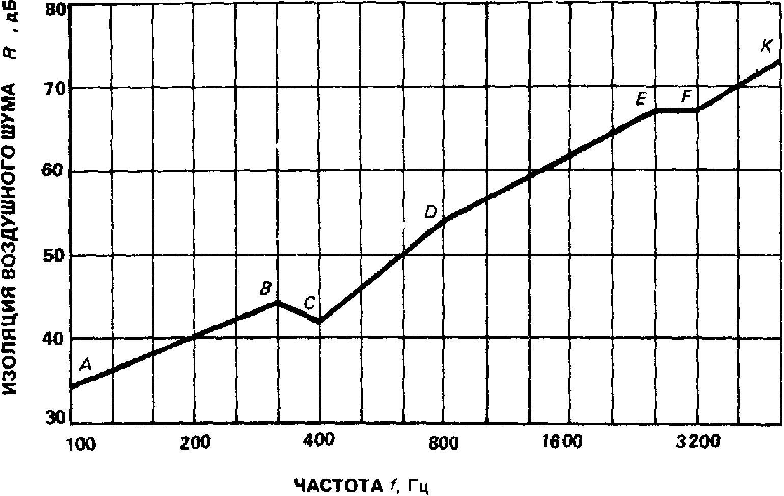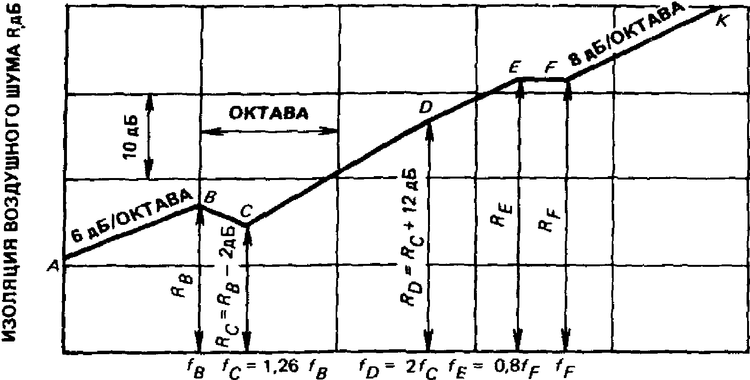 2.4. Частотную характеристику изоляции воздушного шума стенами без дверей (с воздушной прослойкой в пределах 4 - 10 см) следует определять графическим способом, изображая ее в виде ломаной линии, аналогичной ABCDEFK на