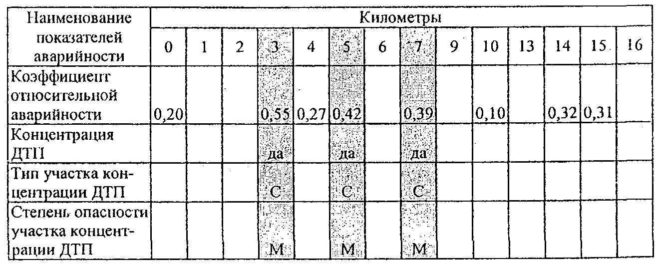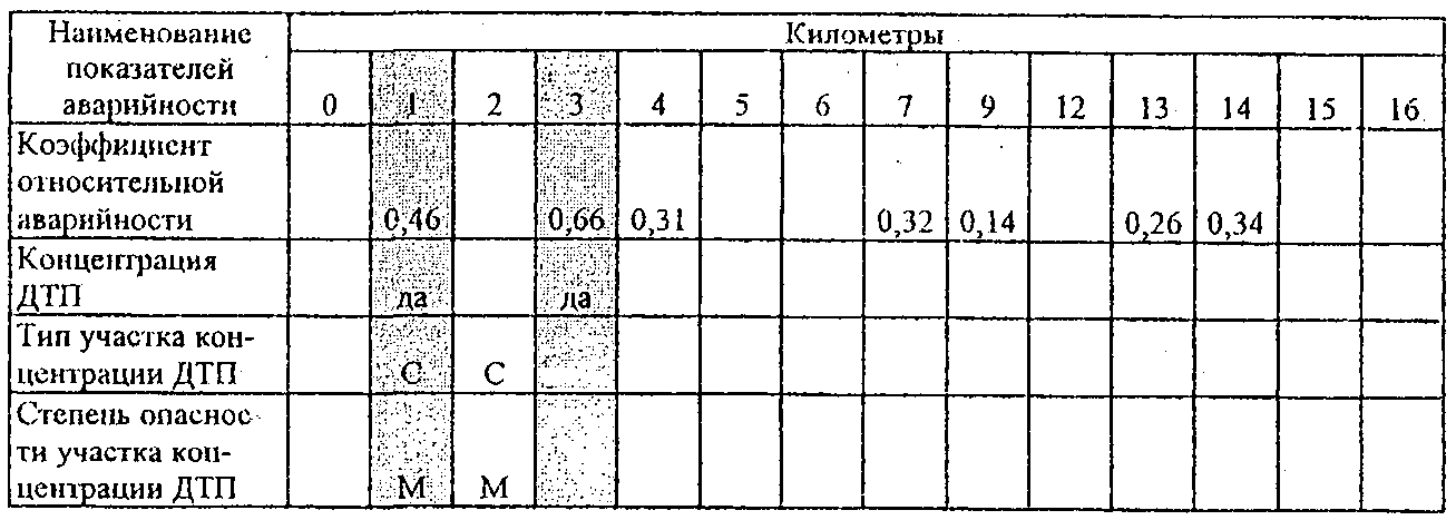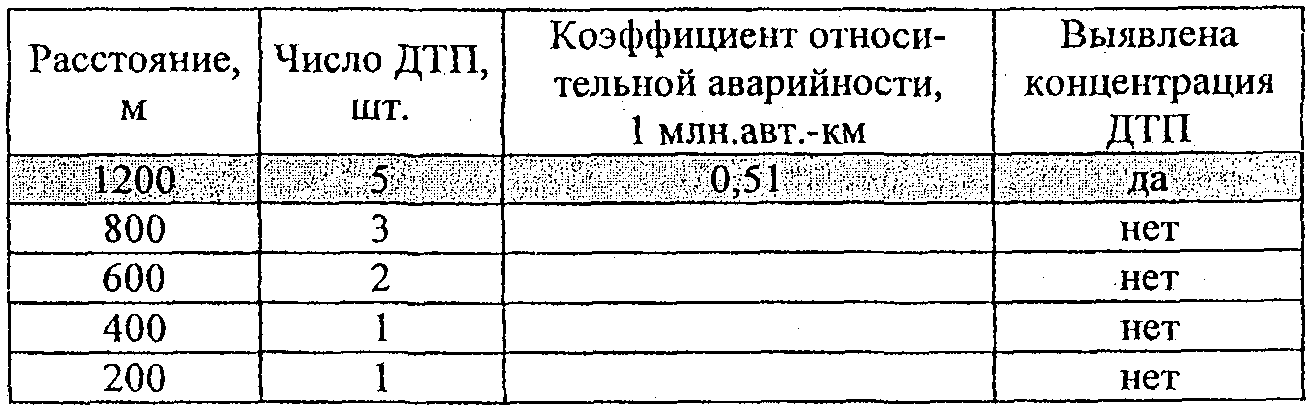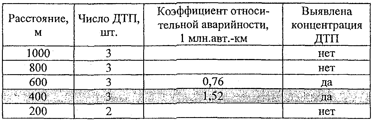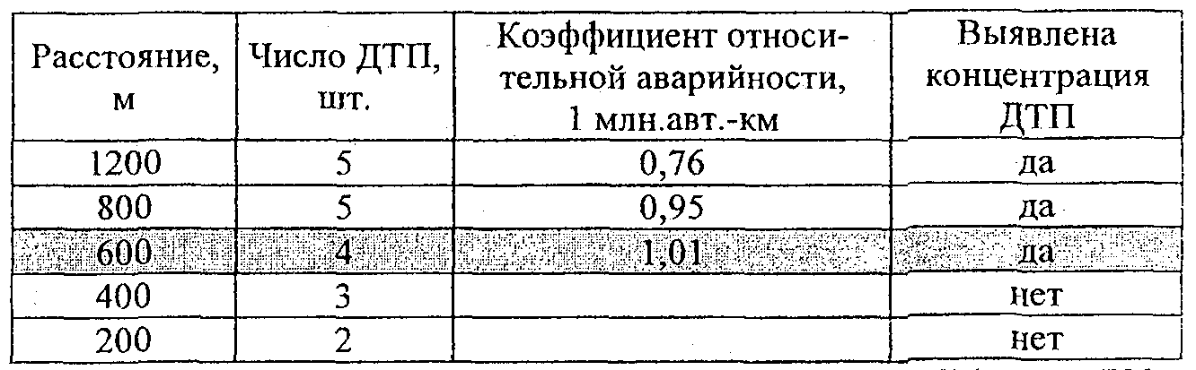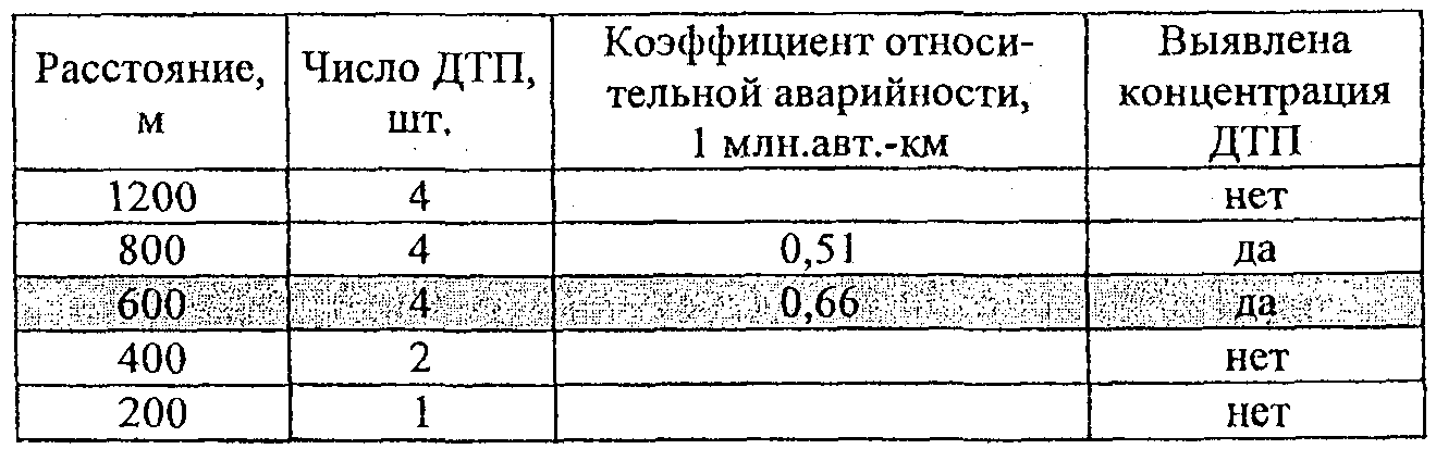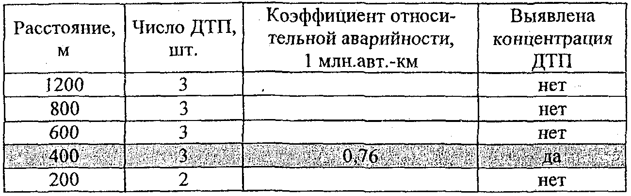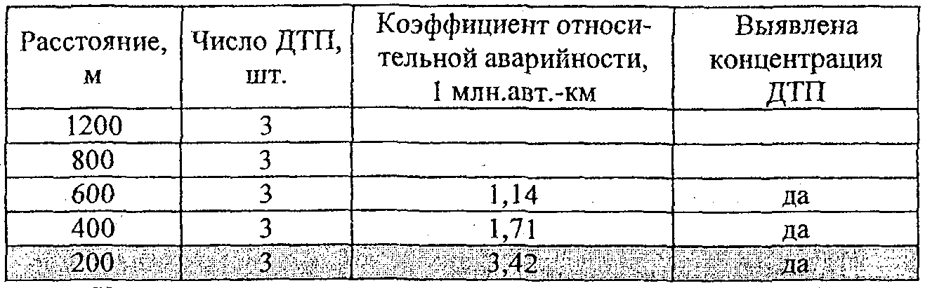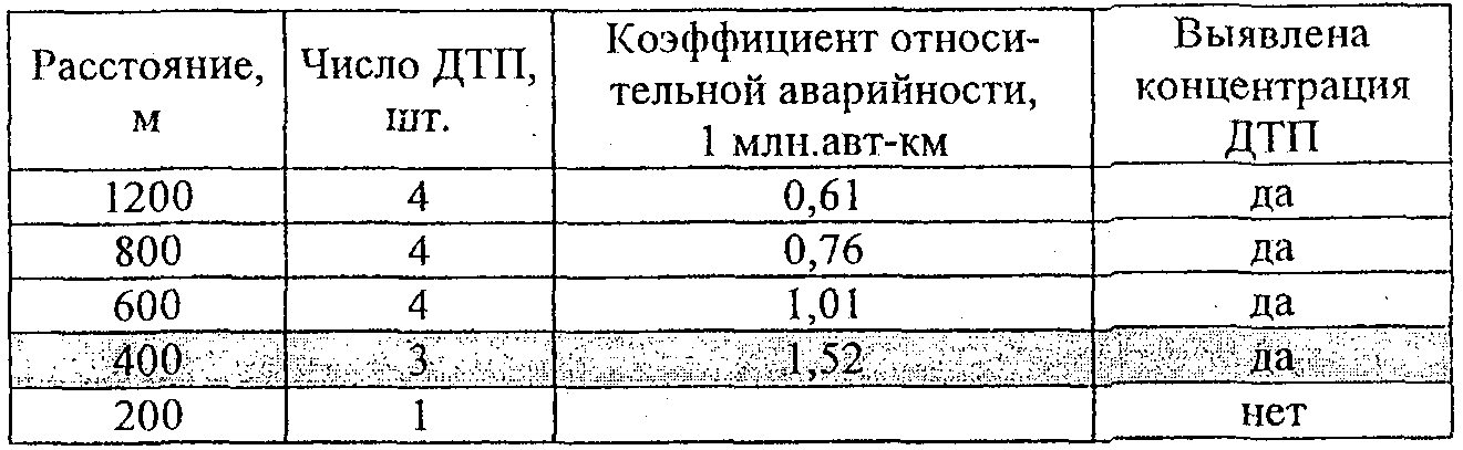 По вычисленным значениям фактической плотности ДТП и наблюдаемой интенсивности движения с использованием табл. 2.2 определяют участки концентрации ДТП.