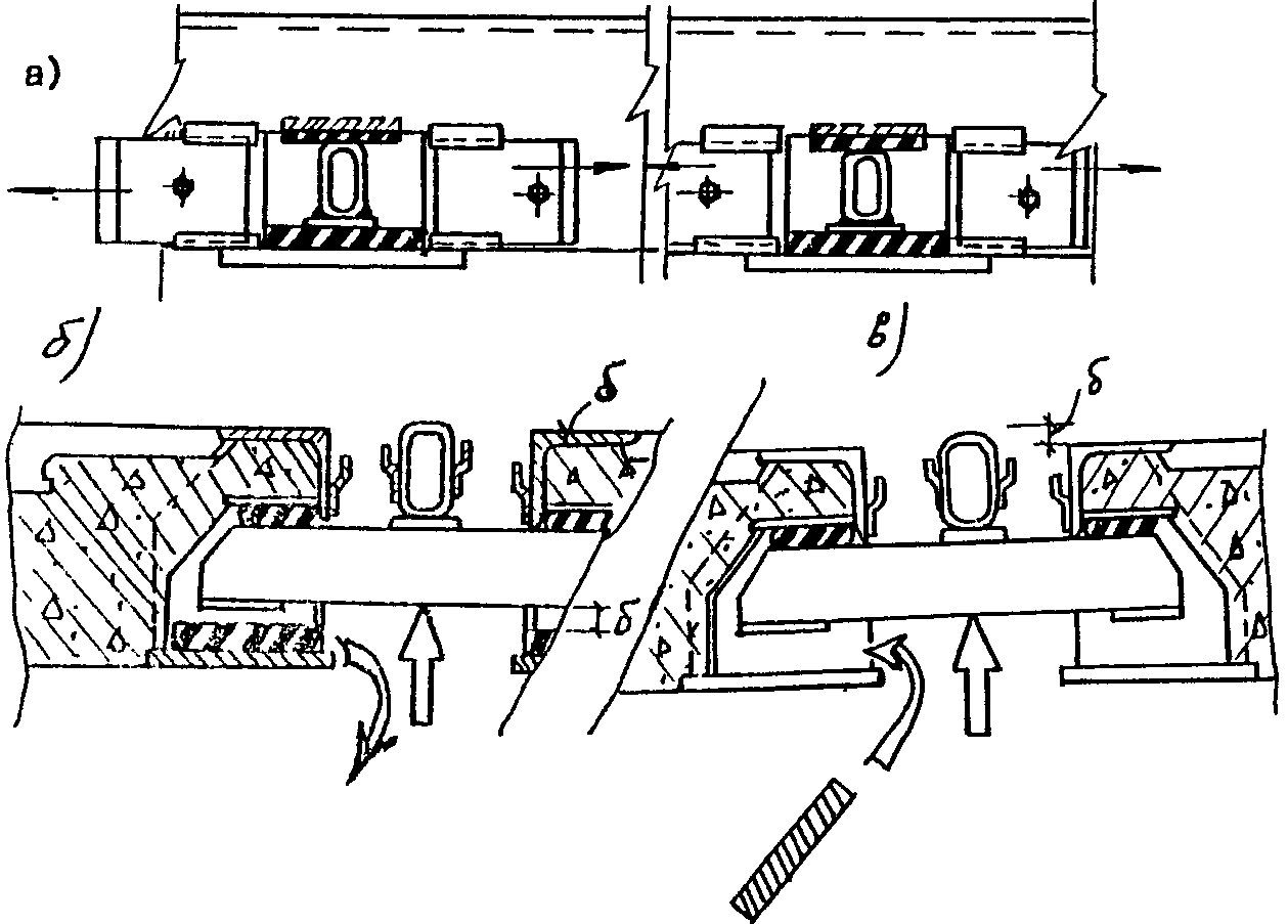 рис. 2.1, а) включает в себя два уголка с ребрами жесткости с внутренней стороны и фиксаторами с наружной стороны профиля. Фиксатор приварен к полке электрозаклепками и продольными (фланговыми) прерывистыми швами сверху и снизу. Устанавливаемые в фиксатор концы компенсатора заклинивают полосами, которые также приваривают прерывистым швом (l = 40 - 50 мм через 150 - 200 мм) к обушку уголка (рис. 2.1, б). Установку компенсатора, заклинивание и приварку полос осуществляют на монтаже. Завод-изготовитель поставляет швы полной готовности монтажными пакетами с объединяющими связями. Размеры пакетов и геометрические характеристики конструкций изложены в каталоге завода-изготовителя, данном в
