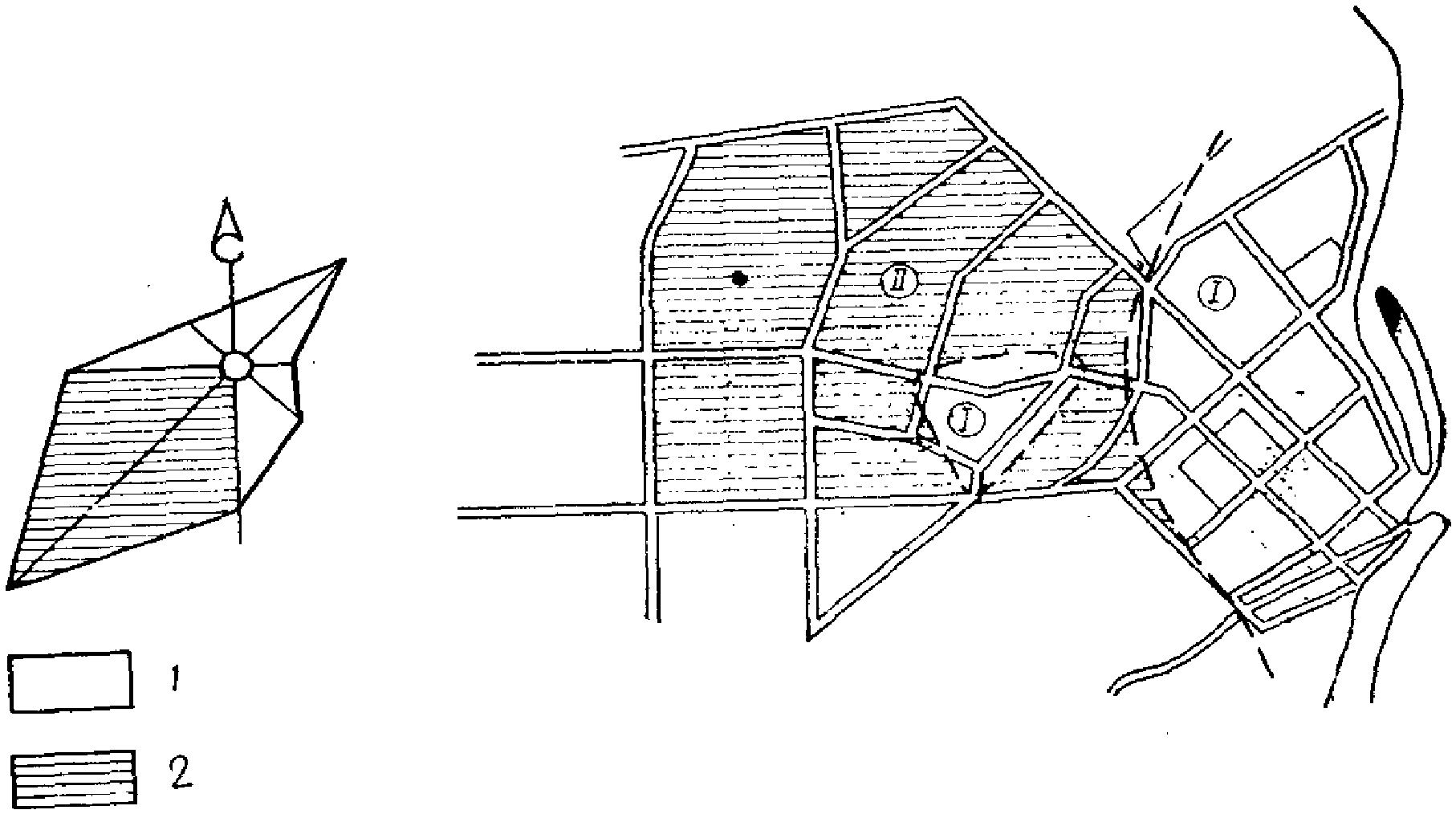 Наиболее рациональное градостроительное освоение территории с точки зрения охраны окружающей среды может быть осуществлено на основе схемы районирования участка местности по температурно-ветровым характеристикам (рис. 19).