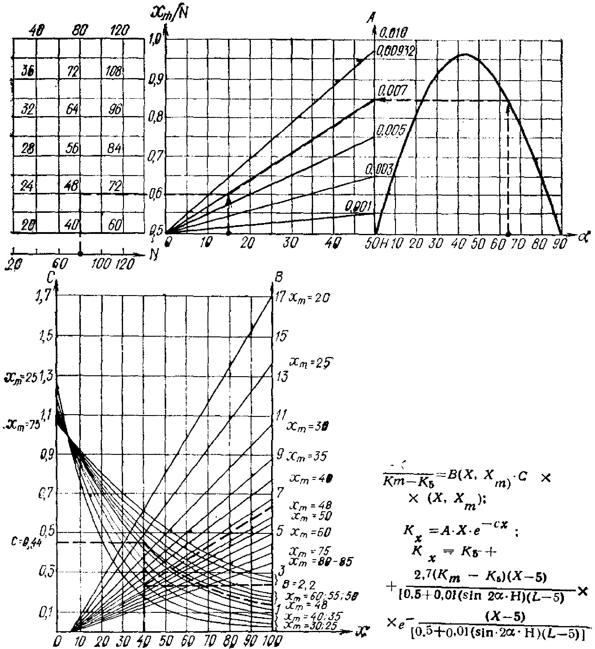 Пользуясь второй частью номограммы, определяем (Kx - K5)./(Kx - K5) для любого значения X и определенного выше значения Xm (то есть графически решаем приведенное выше уравнение).