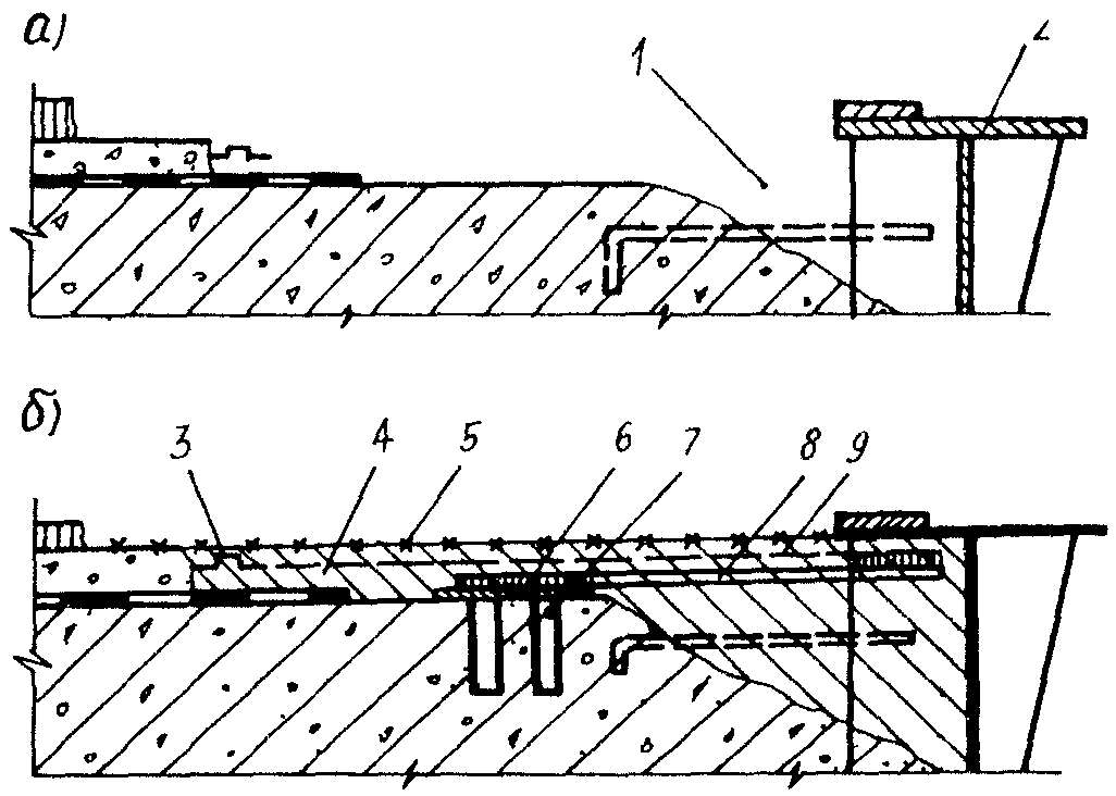 через трубки): 1 - цементобетон 60 мм; 2 - гидроизоляция