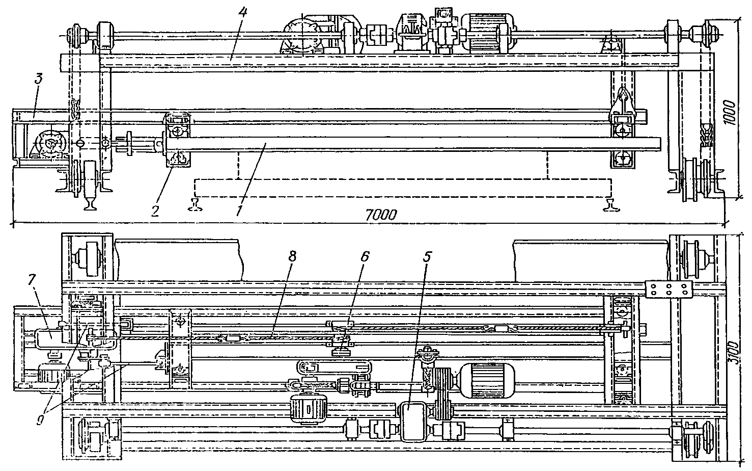 1 - виброплощадка; 2 - рама; 3 - лебедка; 4 - блоки;