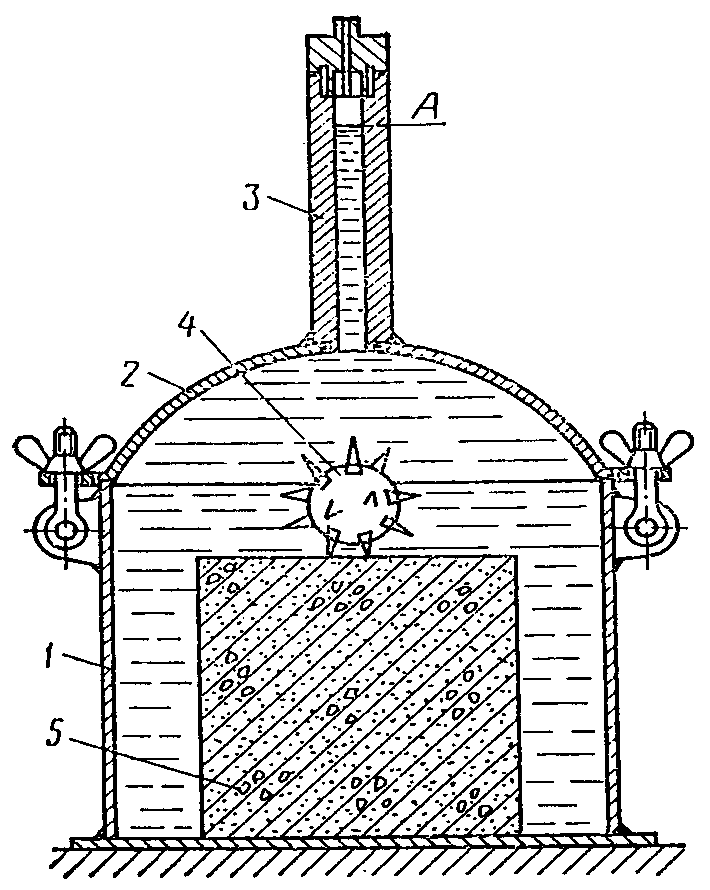 общую массу G4, включающую в себя аэрометр с помещенным в него образцом и воду. Во избежание разрушения образца при заполнении аэрометра водой последняя заливается в два приема: сначала в открытый цилиндр с образцом, затем цилиндр герметически закрывается крышкой, через горловину которой уровень воды доводится до уровня A;