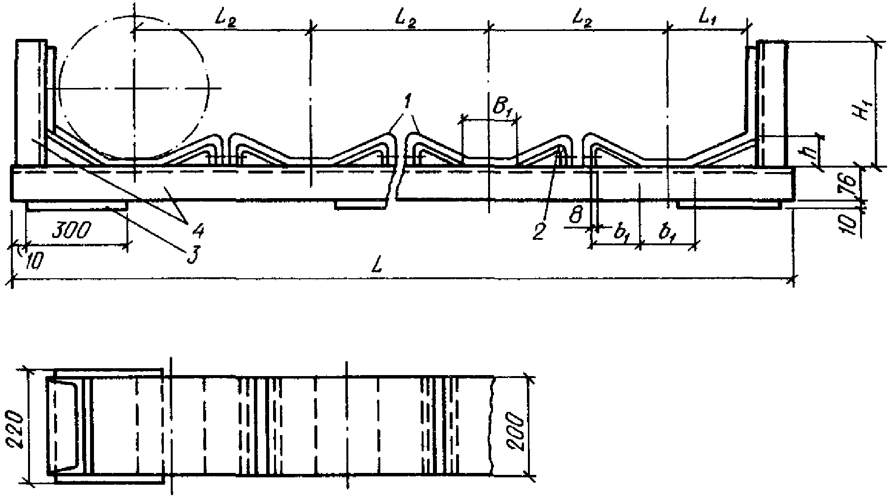 Деревянные брусья того же сечения, расположенные внутри металлических швеллеров с роликами, устанавливают с наружной стороны фрагмента трубы на уровне горизонтального диаметра. С целью равномерной передачи нагрузки на трубу перед установкой брусьев укладывают выравнивающий слой цементного раствора или полосовой резины толщиной 20 мм твердостью по Шору в пределах 45 - 60 (рис. 2).