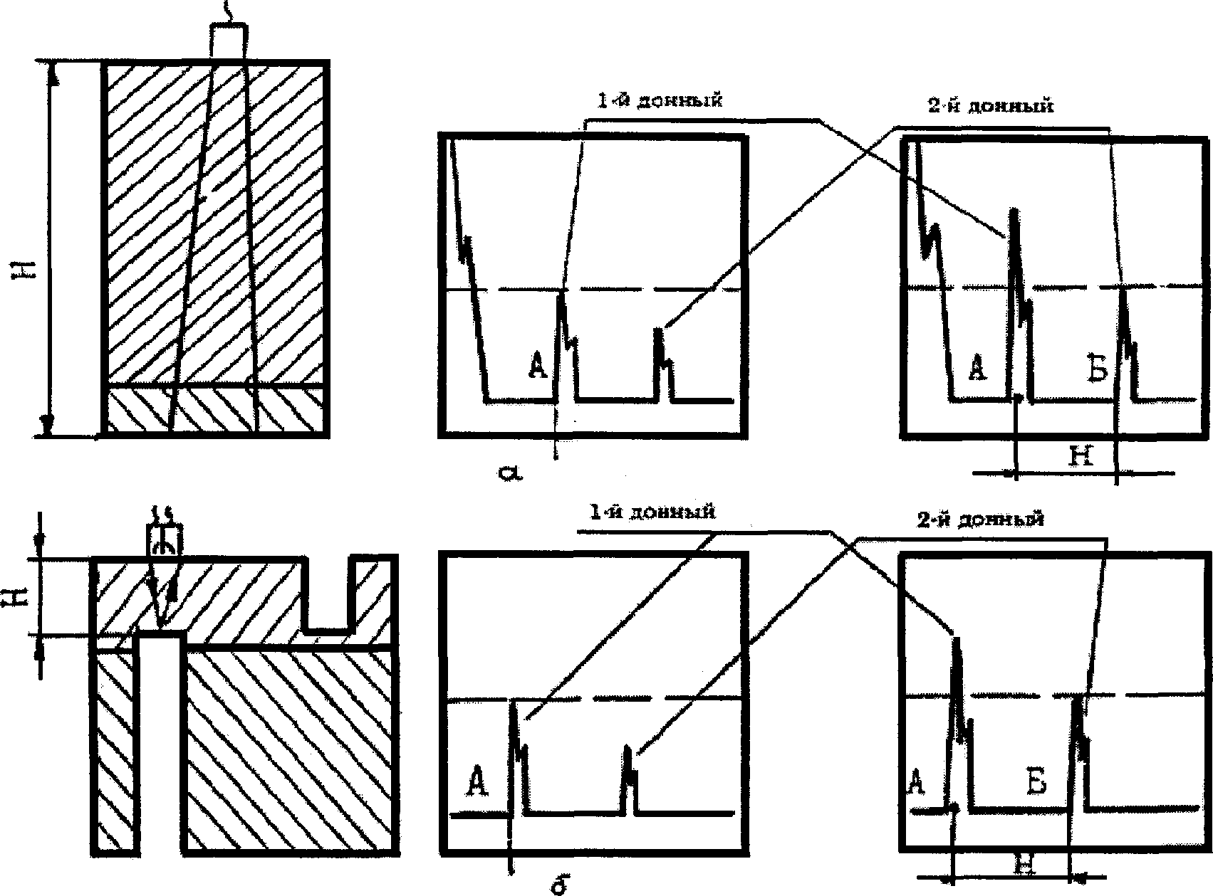 7.7.8. При отсутствии эхо-импульса от зоны сплавления перед первым донным сигналом необходимо использовать для измерения второй или третий донный сигнал и соответствующий эхо-импульс от зоны сплавления (рис. 13) или применить наклонный ПЭП.