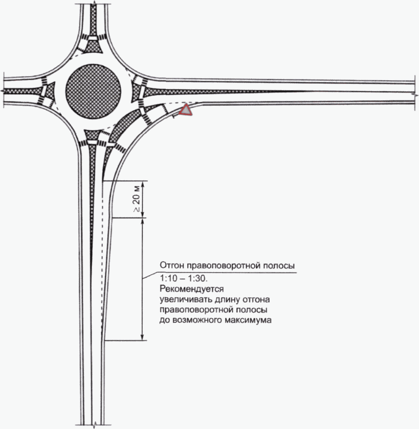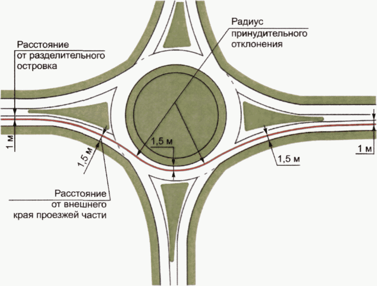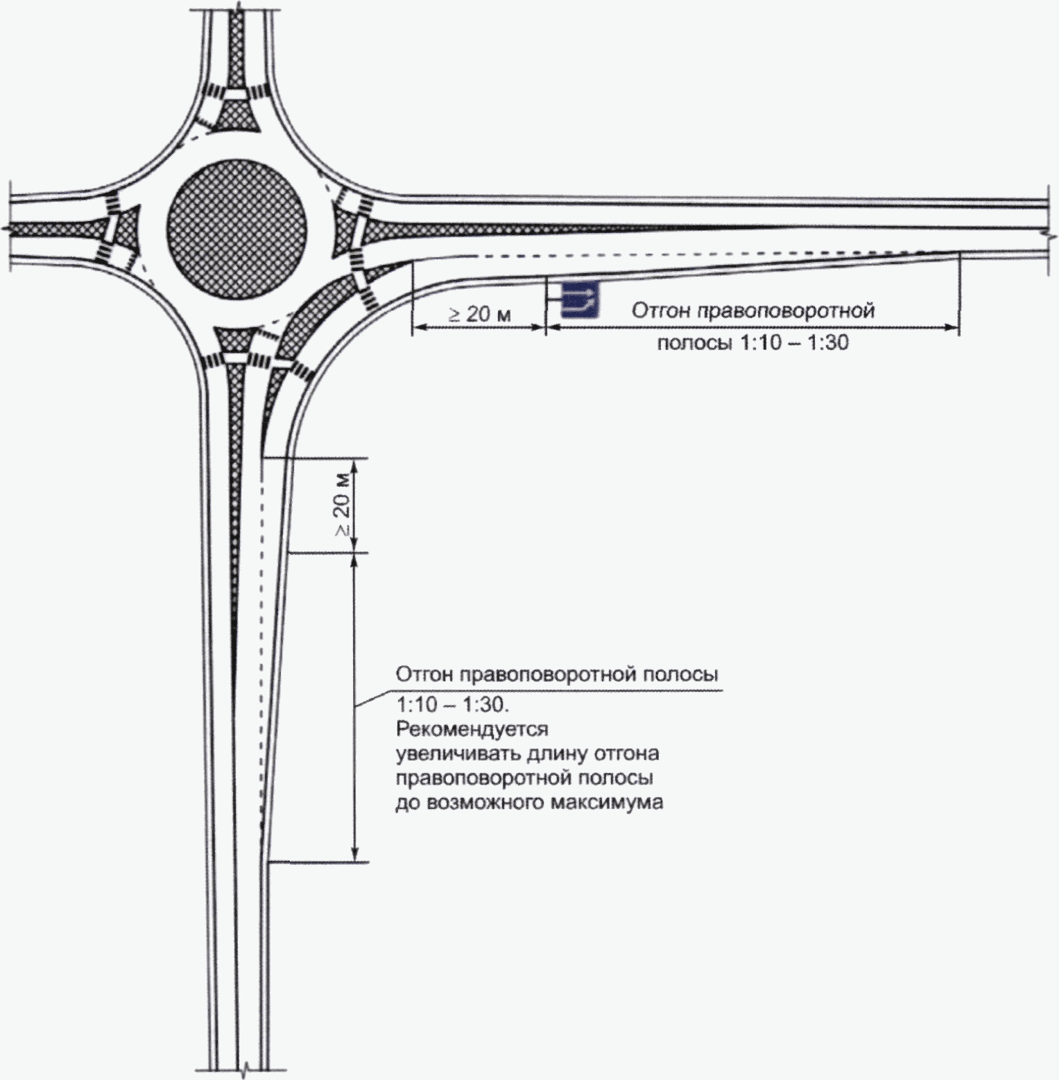- дополнительных левых или правых полос на въезде на кольцевое пересечение;