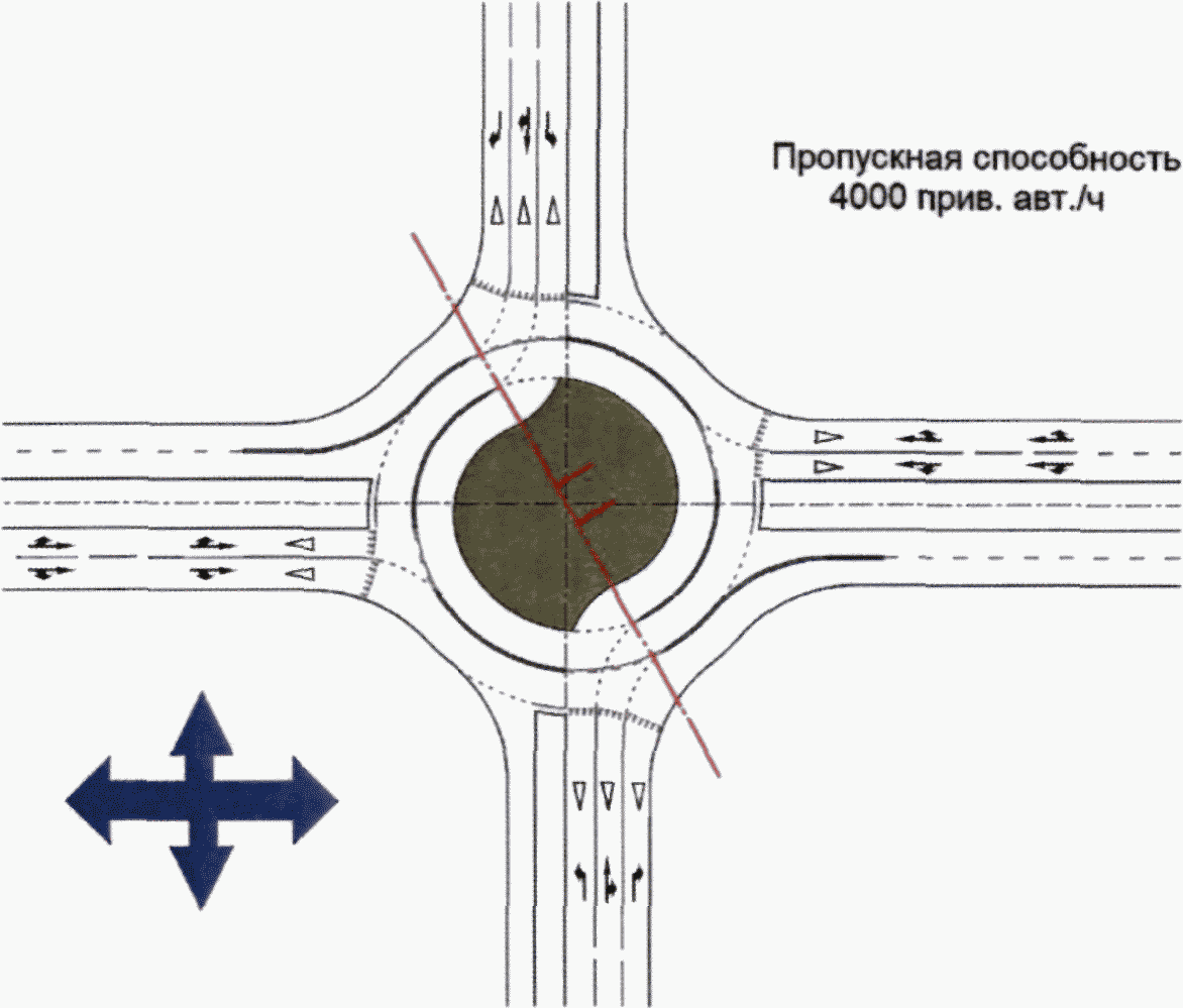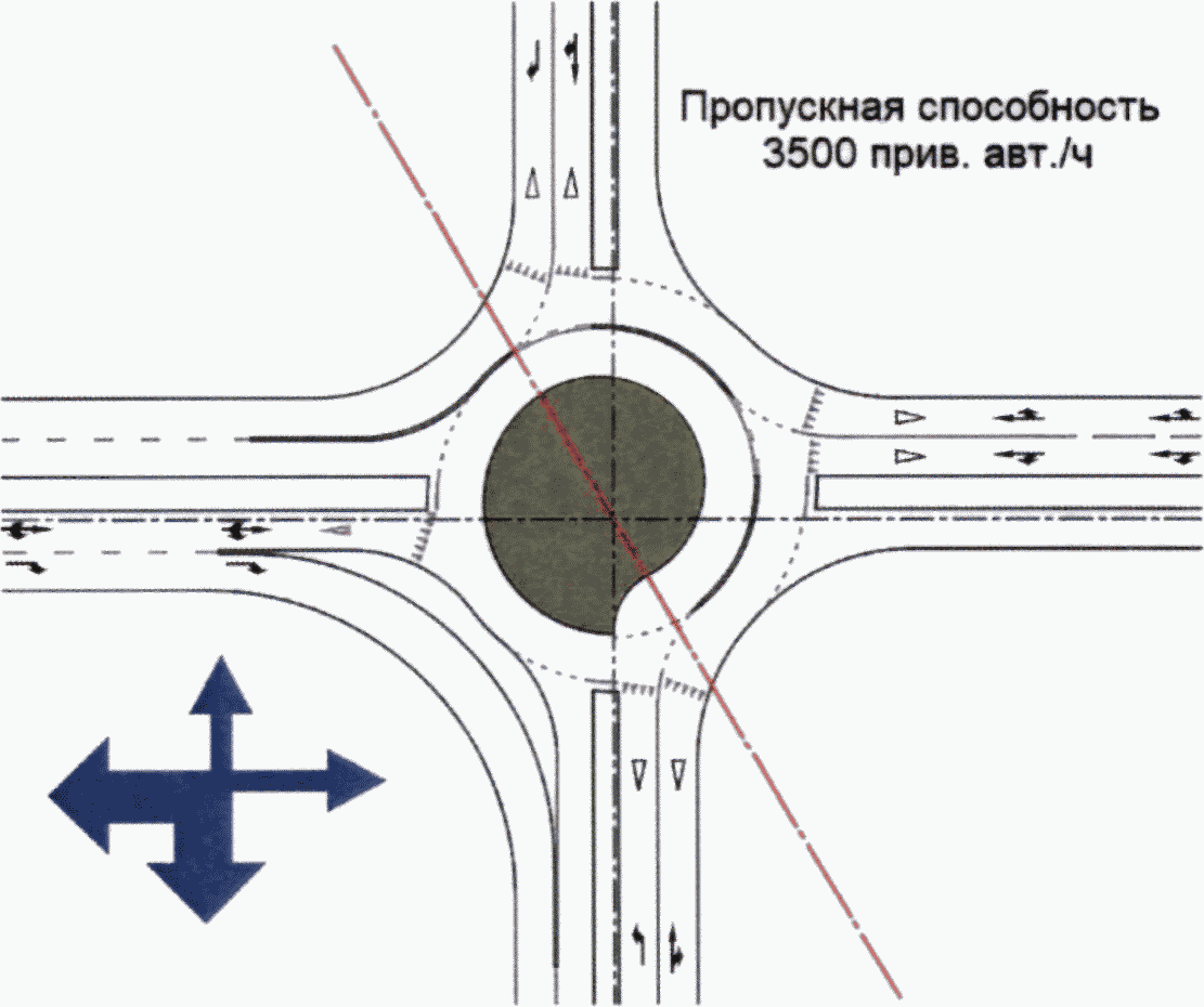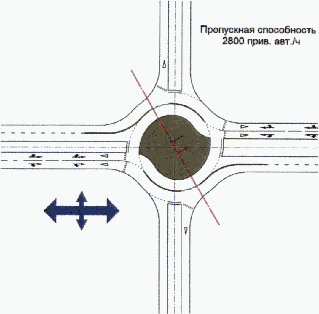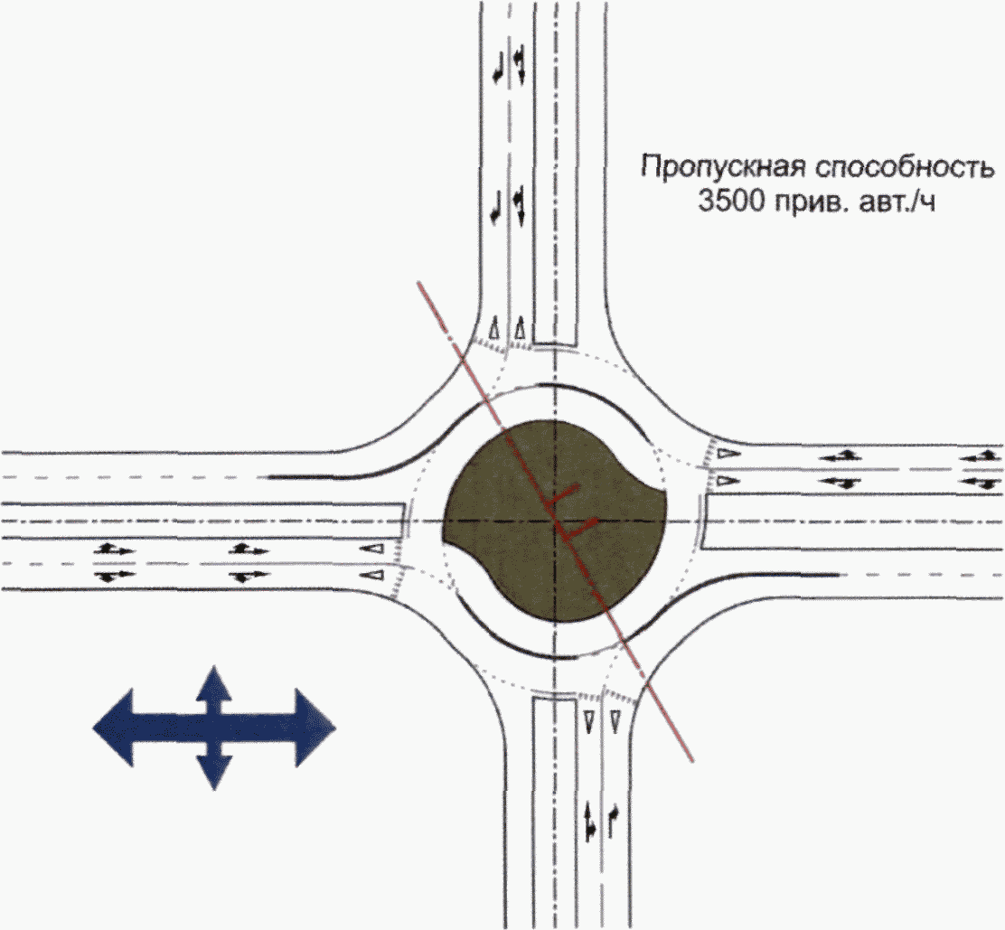 - устройство левой полосы на въезде на кольцевое пересечение приведет к превышению пропускной способности на участке уширения над пропускной способностью следующих участков;