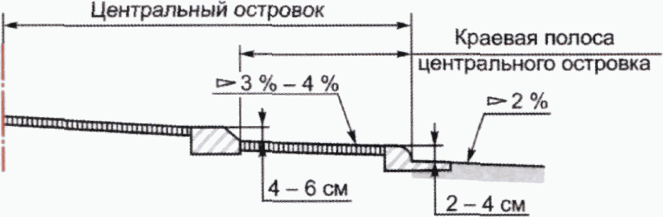 3.6 краевая полоса центрального островка: Полоса центрального островка, расположенная с внешней его стороны и предназначенная для заезда задними колесами крупногабаритных автомобилей.