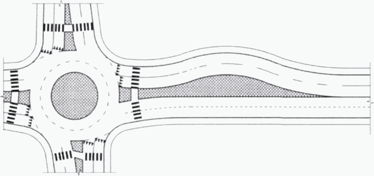 Кольцевые пересечения могут также применяться в качестве граничного элемента, указывающего на изменение дорожных условий.