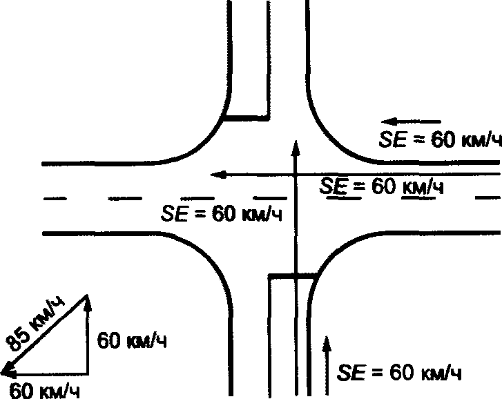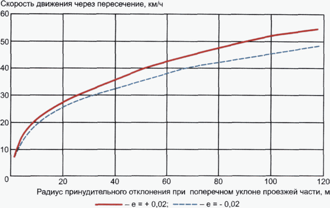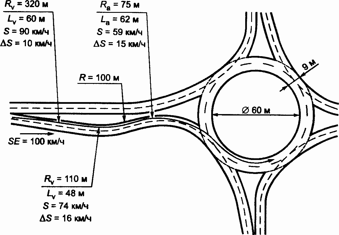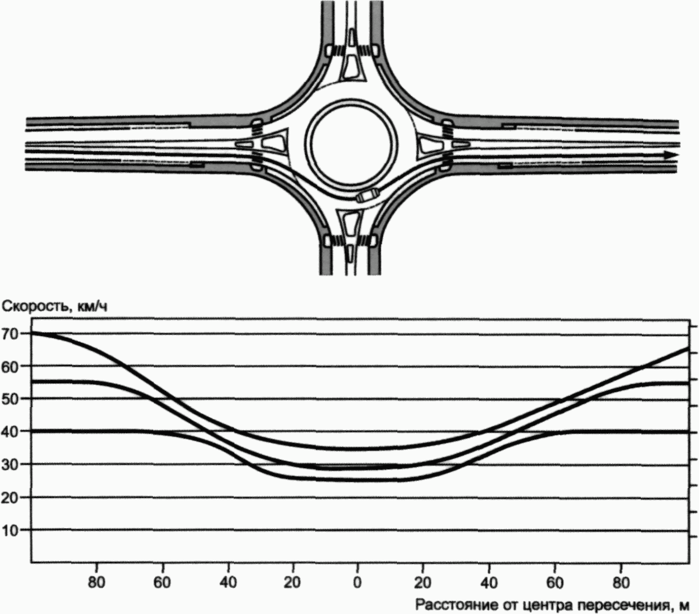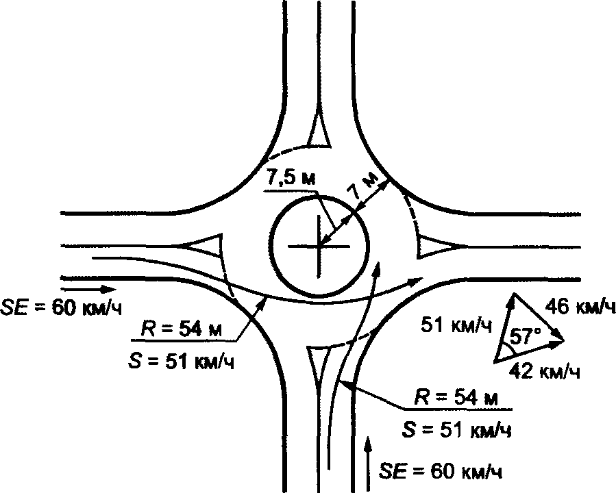 3.18 расчетная скорость движения кольцевого пересечения: Скорость одиночного автомобиля, обеспечивающая безопасность движения на кольце; используется при расчете геометрических элементов пересечения.
