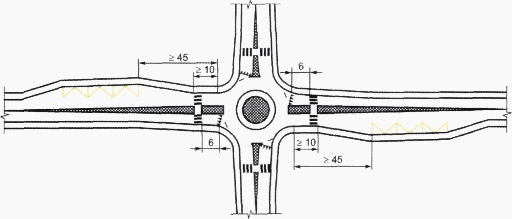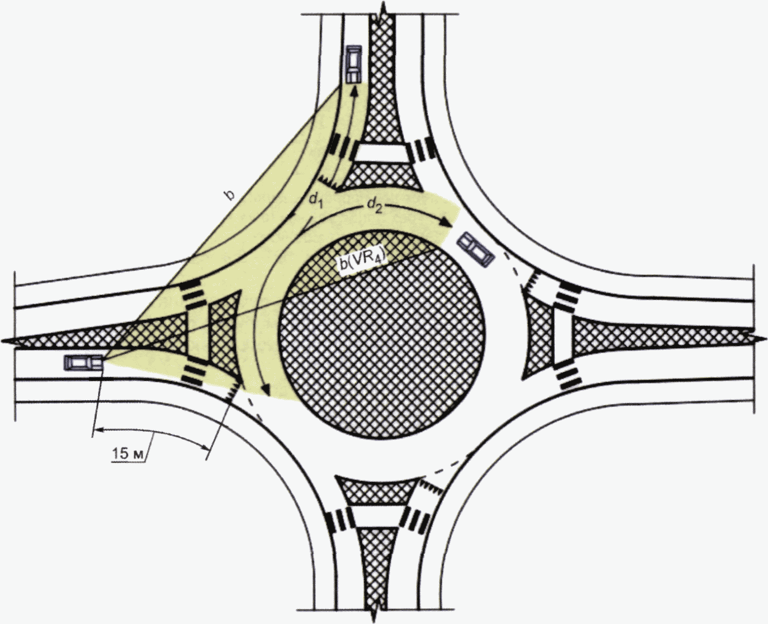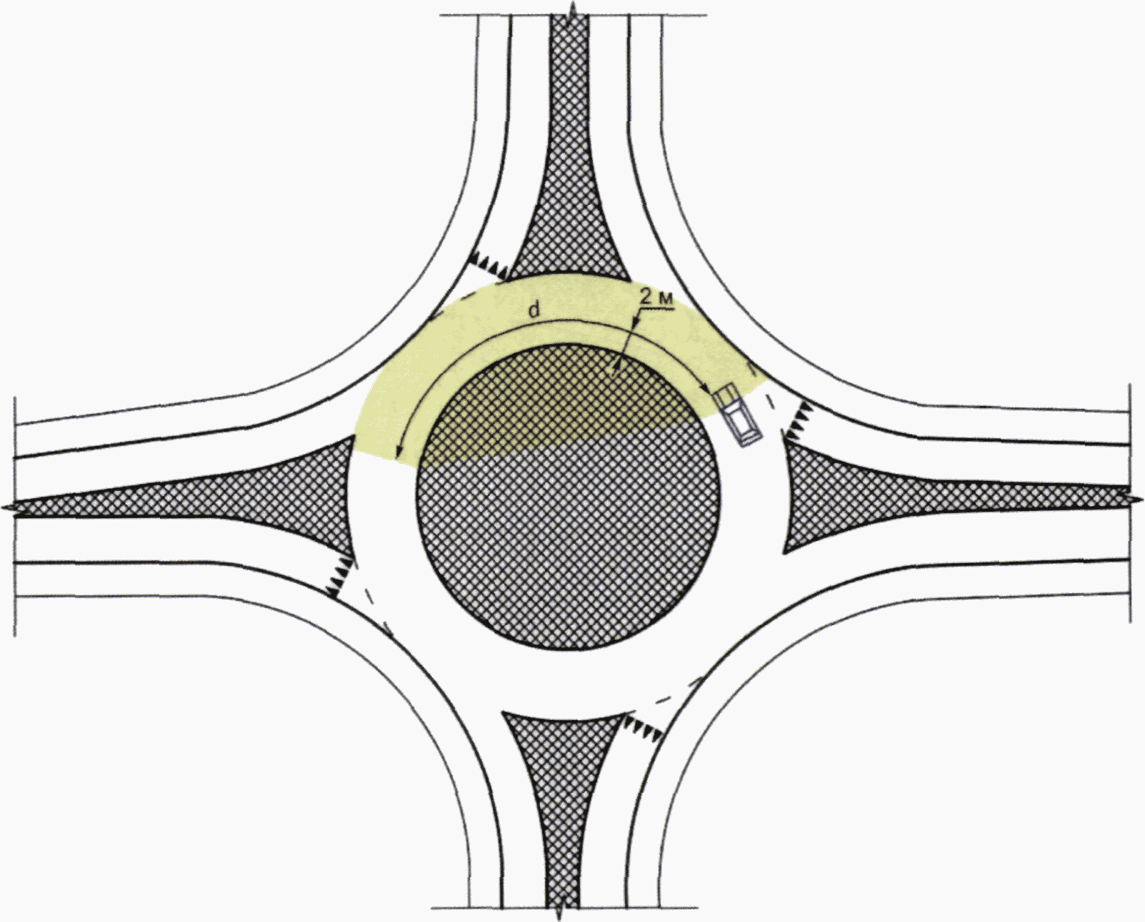 4.2 Кольцевые пересечения следует проектировать с приоритетом автомобилей, находящихся на кольцевой проезжей части в соответствии с