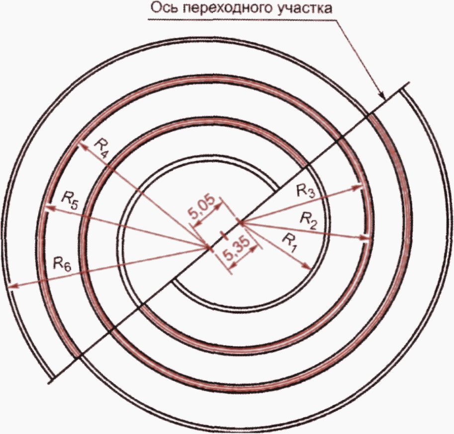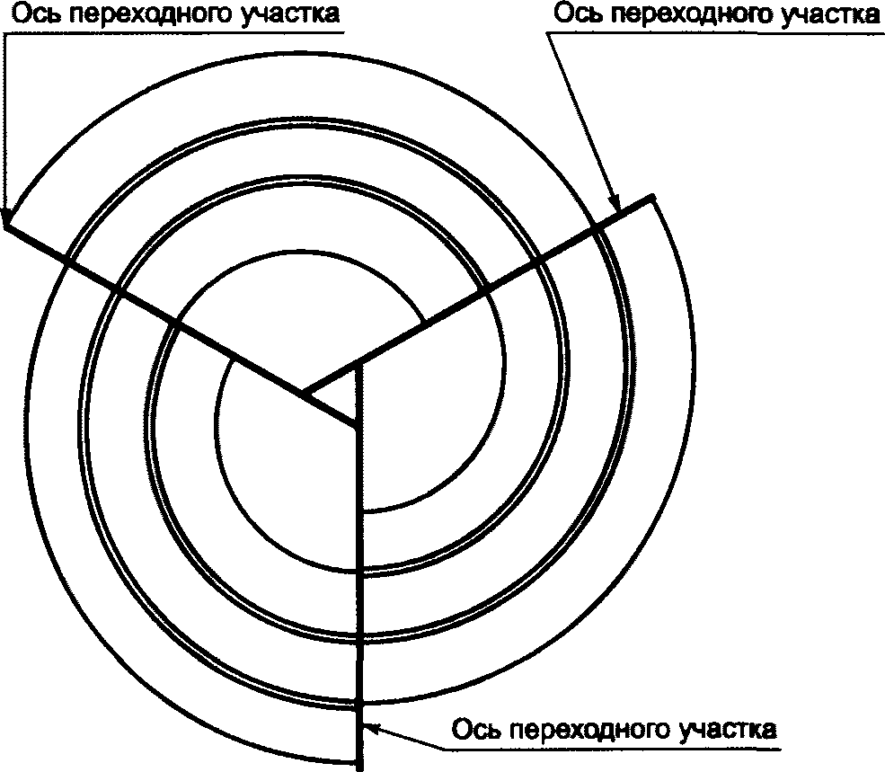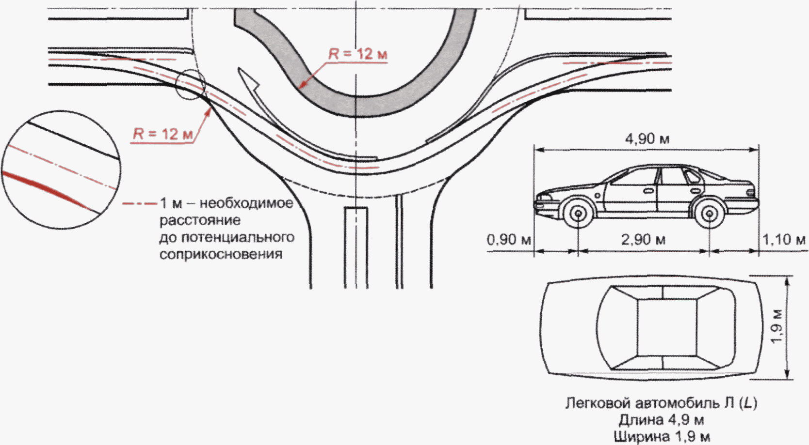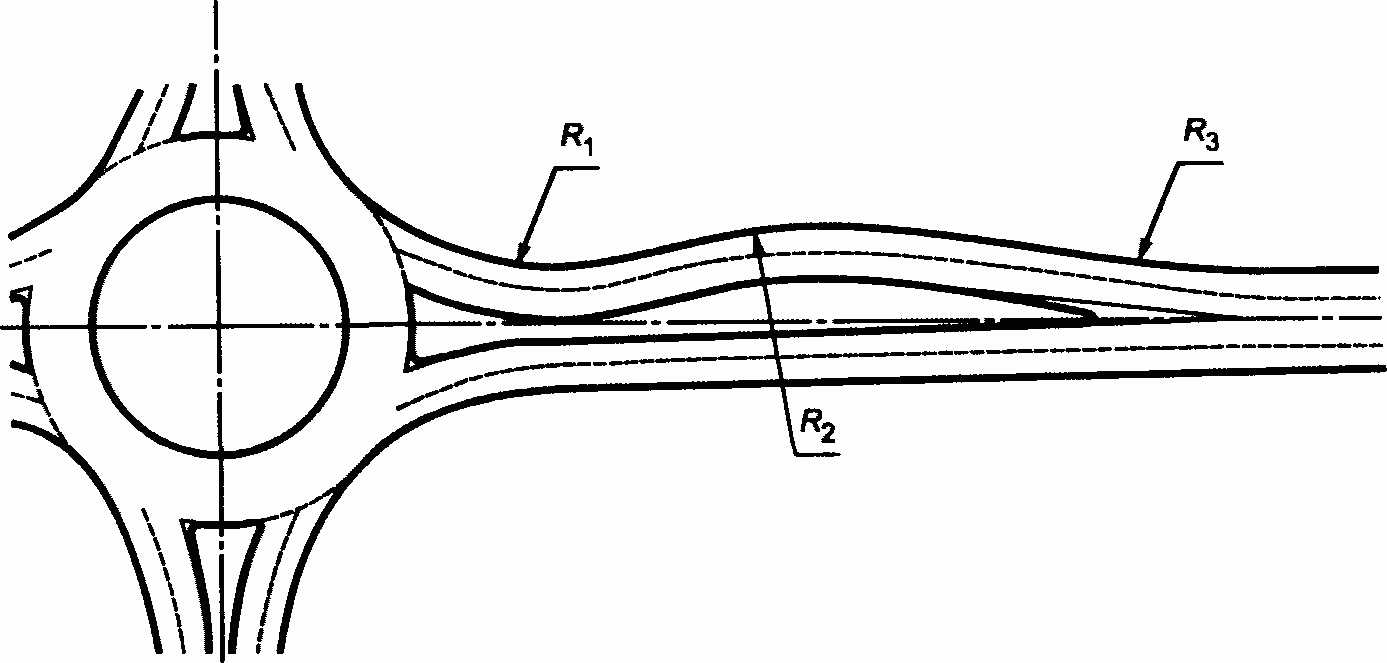 3.20 траектории свободного проезда кольцевого пересечения: Траектории свободного проезда легковых автомобилей по каждому из направлений: при въезде на кольцевую проезжую часть, на участке движения по кольцевой проезжей части и при выезде с нее.