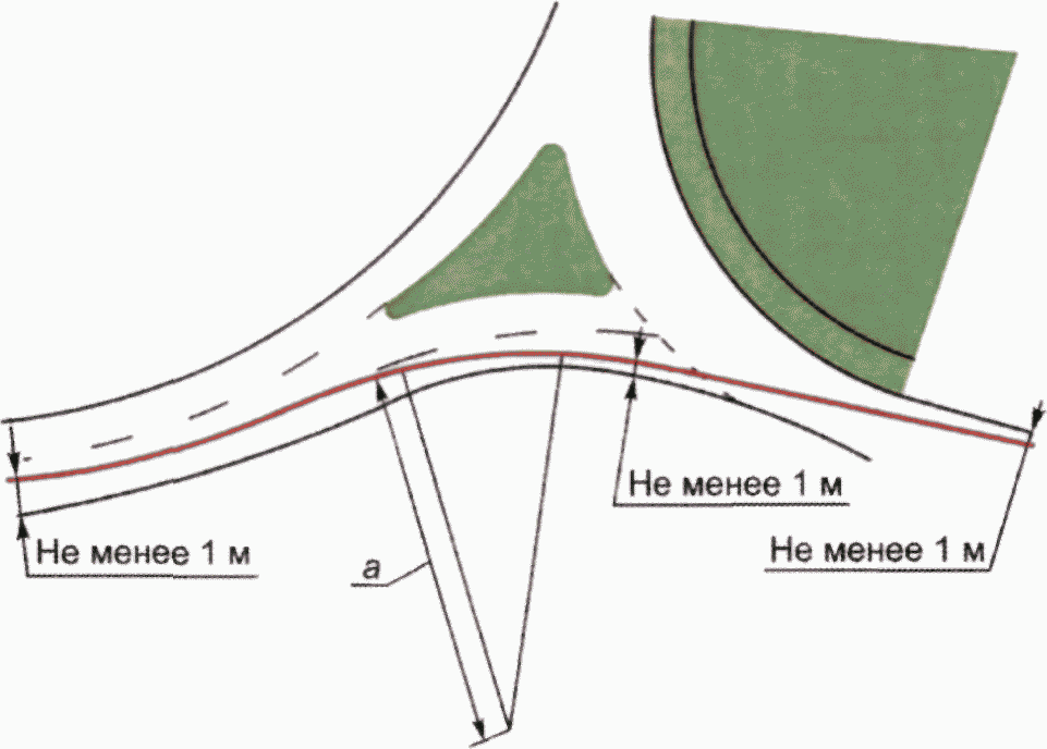 3.23 участок подхода к кольцевому пересечению: Участок автомобильной дороги, в пределах которого изменяют ее геометрические размеры для обеспечения удобных и безопасных условий въезда на кольцевую проезжую часть и выезда с нее на автомобильную дорогу.
