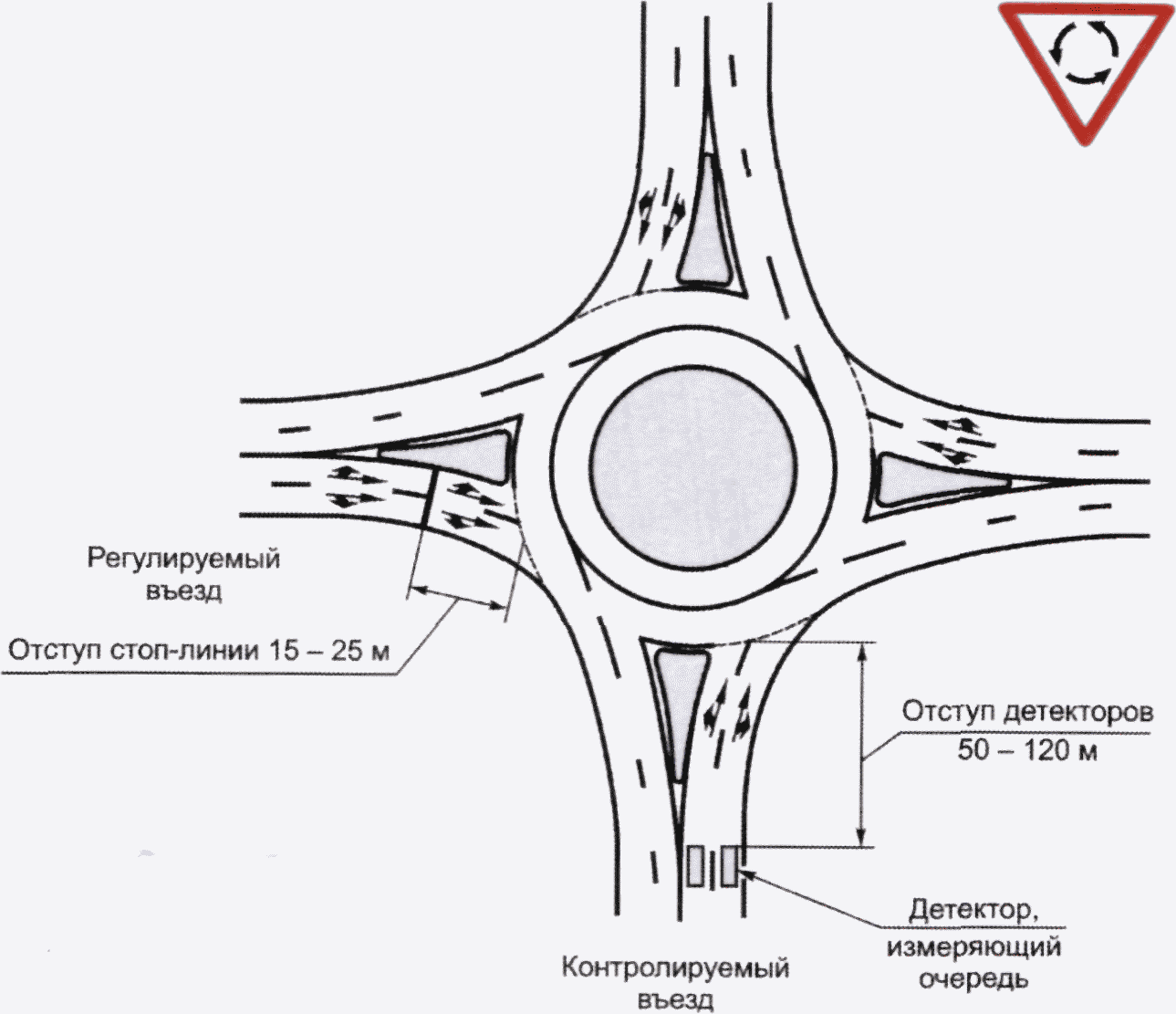 Е.3.1 Регулирование въезда на кольцевое пересечение осуществляется в целях снижения отрицательного влияния дисбаланса транспортных потоков на пересечении, в результате которого может быть блокирован один или несколько подходов к пересечению.