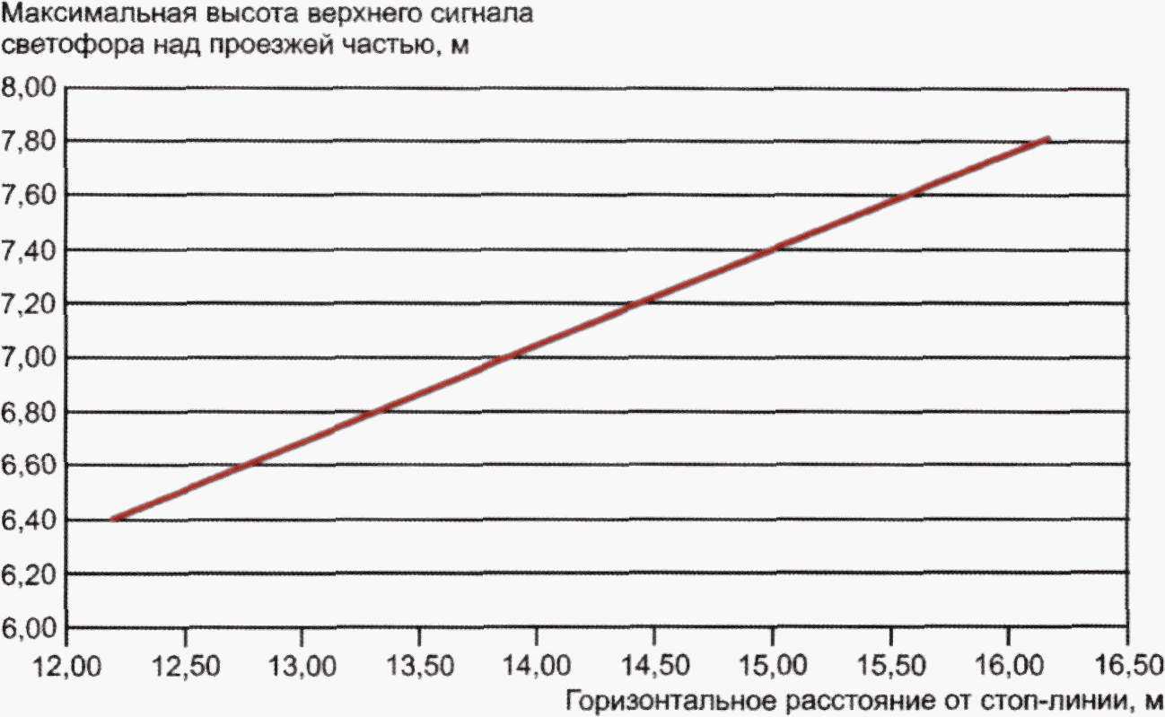 Е.5.8 Максимальная высота установки верхнего сигнала светофора над покрытием проезжей части дороги ограничивается и регламентируется ограничением видимости светофора водителем. Максимальная высота расположения сигнала светофора, расположенного на расстоянии от 12 до 16 м за линией остановки на светофоре (стоп-линией), приведена на рисунке Е.12.
