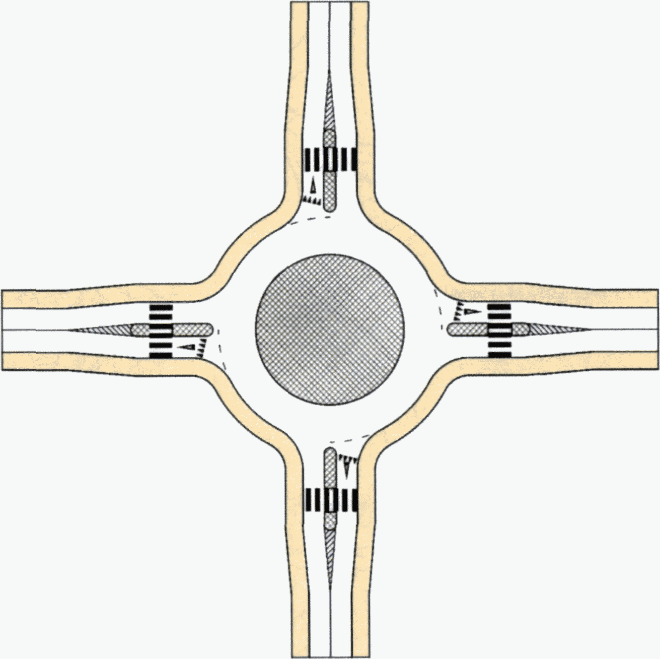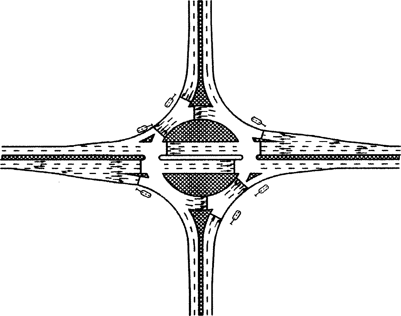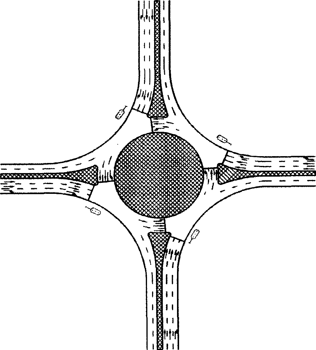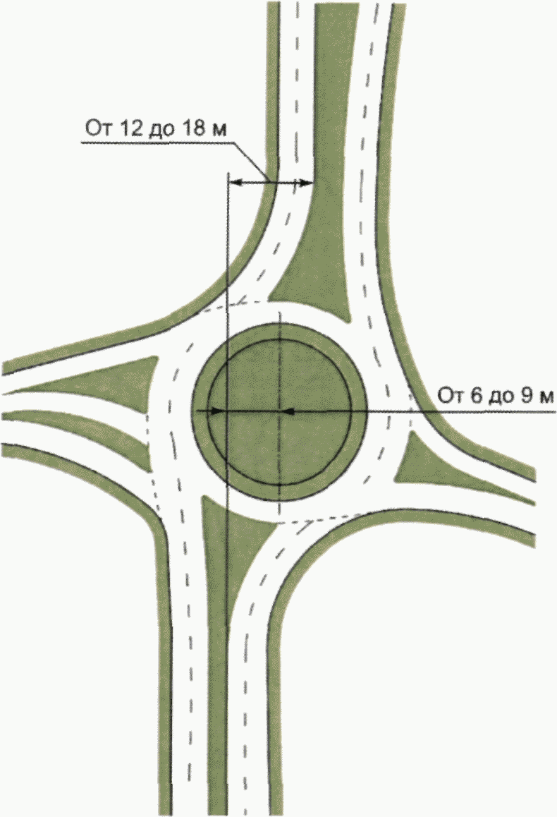 3.3 кольцевое пересечение: Пересечение в одном уровне с центральным островком, как правило, в форме окружности, и кольцевой проезжей частью, по которой осуществляется движение автомобилей против часовой стрелки.