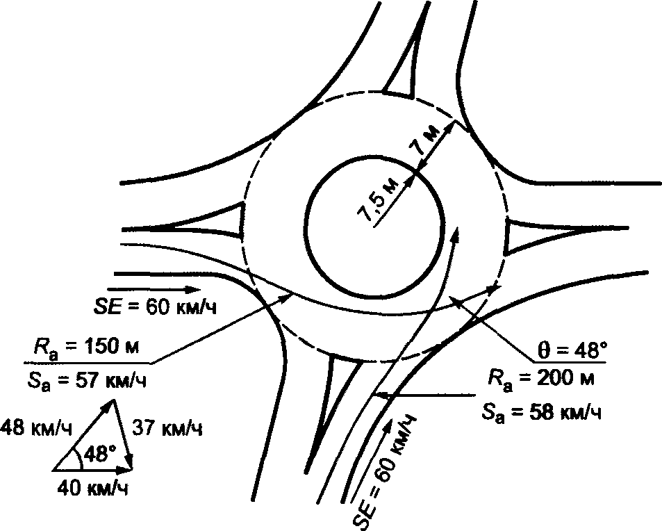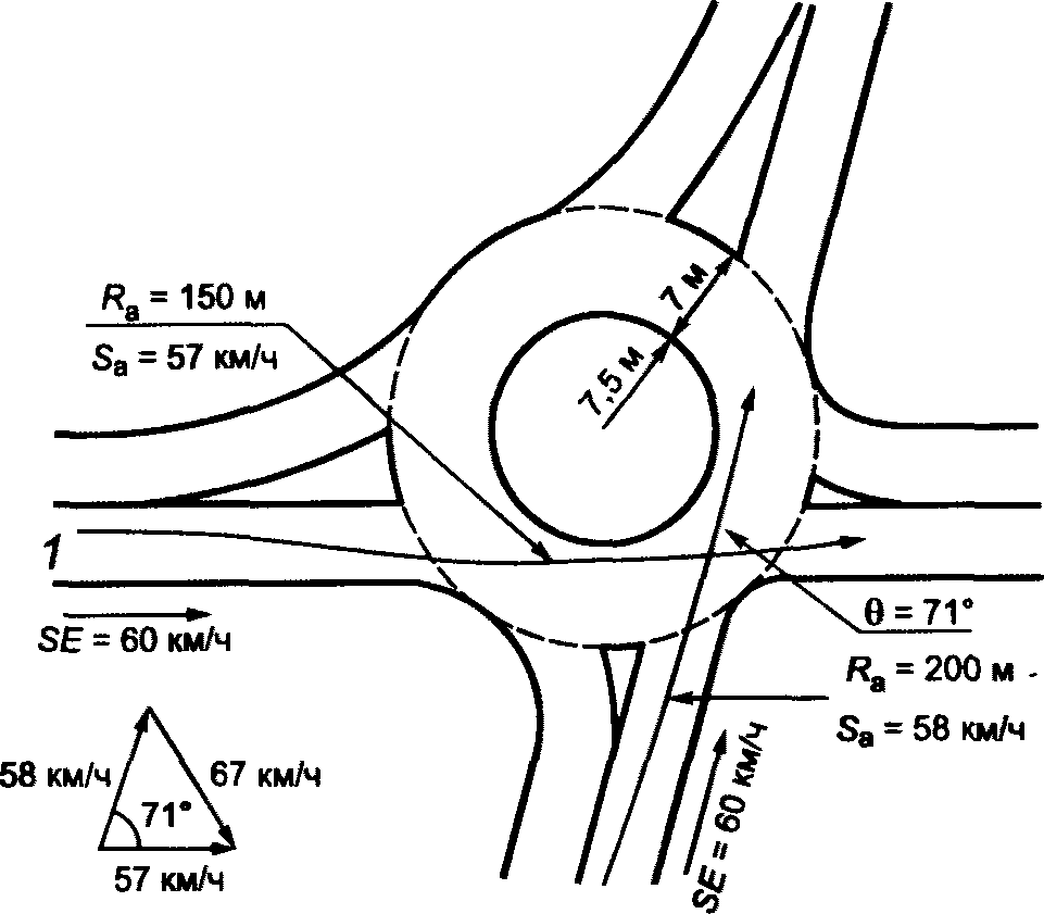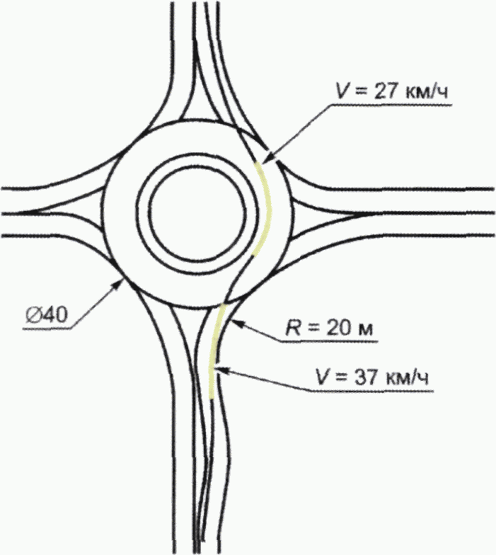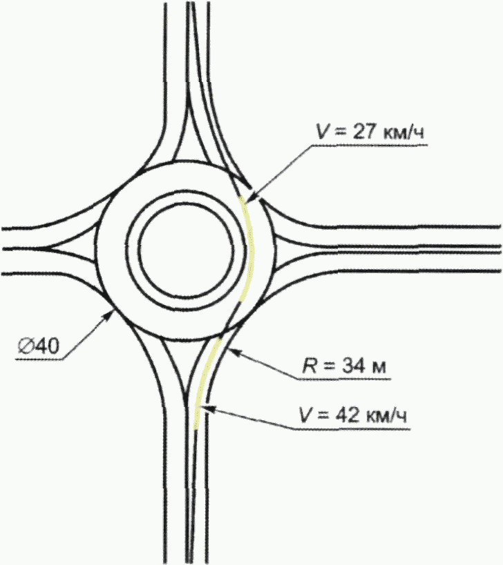 3.19 расчетная скорость движения на участке въезда на кольцо: Скорость одиночного автомобиля, обеспечивающая безопасность движения на кольце; используется при расчете геометрических элементов участка въезда на кольцевую проезжую часть.