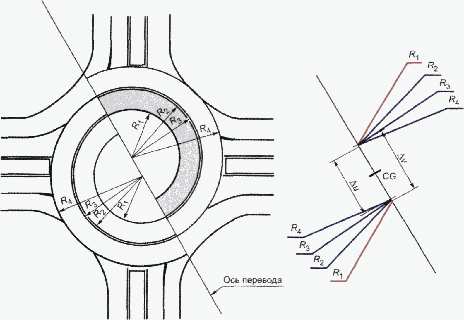 3.10 отклонение траектории движения: Смещение траектории автомобилей левоповоротного и прямого (транзитного) транспортных потоков по отношению к положению автомобилей при въезде на кольцевую проезжую часть.