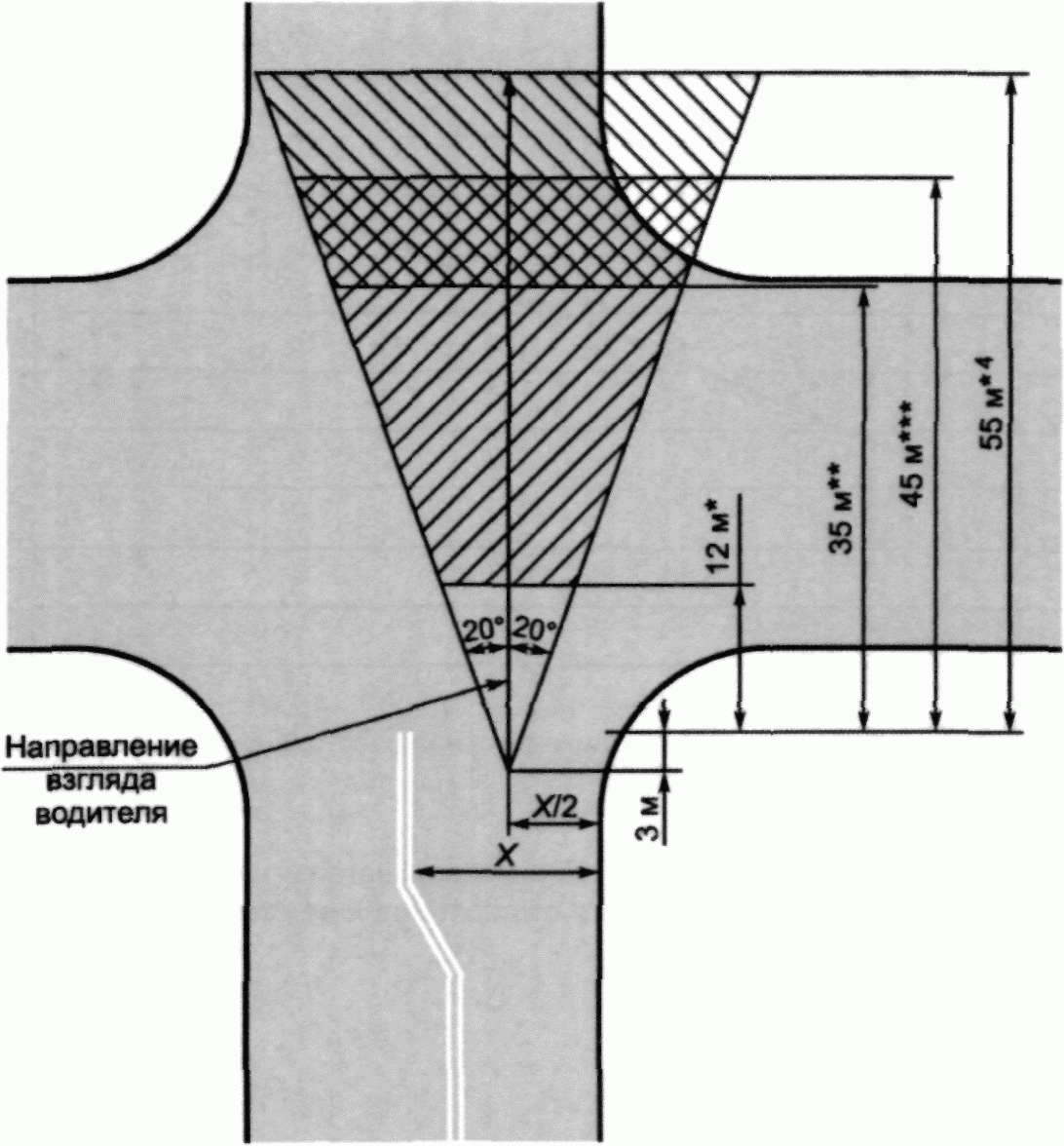 (рисунок Е.11). Расположение водителя принимается на центре проезжей части (при числе полос движения не более двух) или каждой полосы движения соответствующего направления на расстоянии 3 м до стоп-линии.